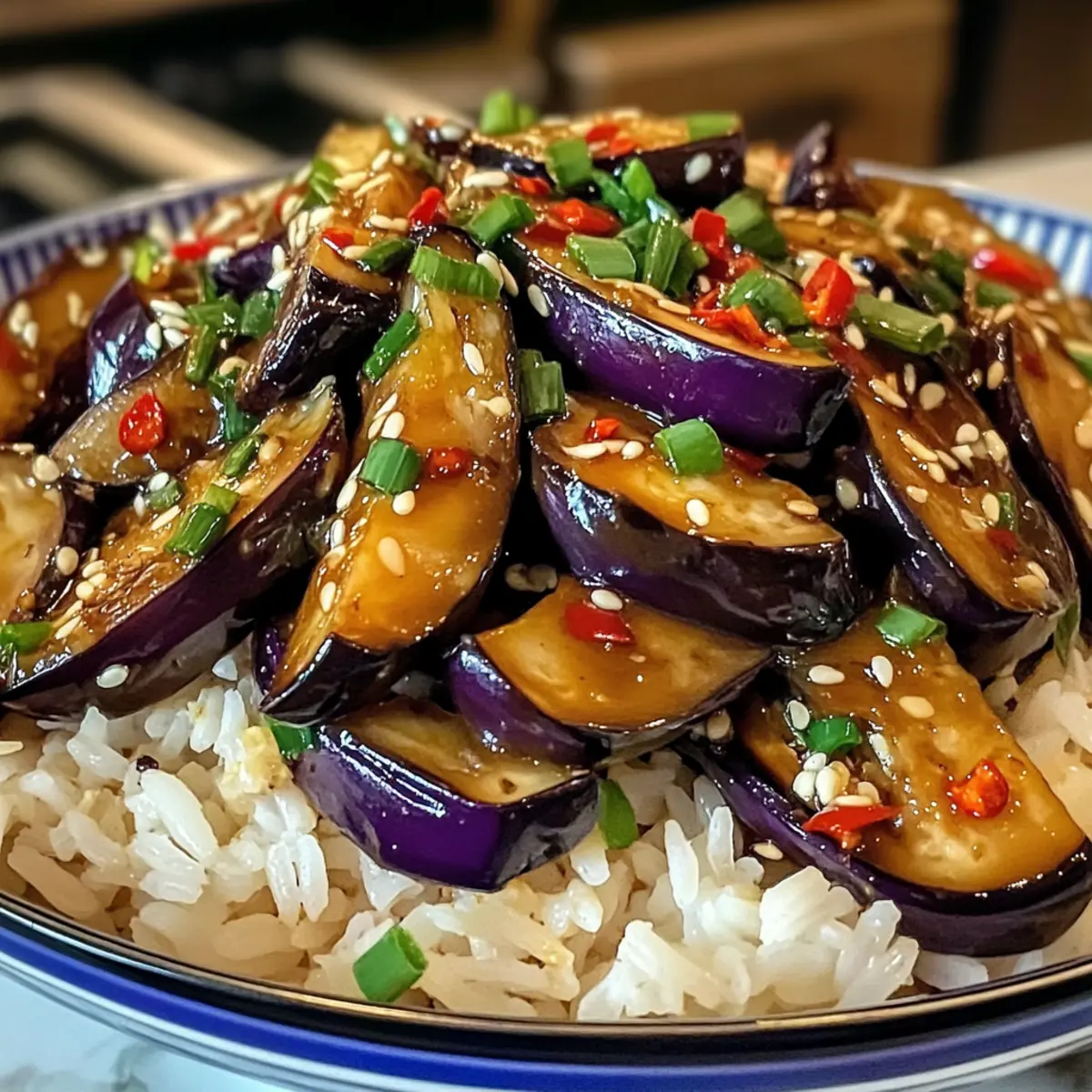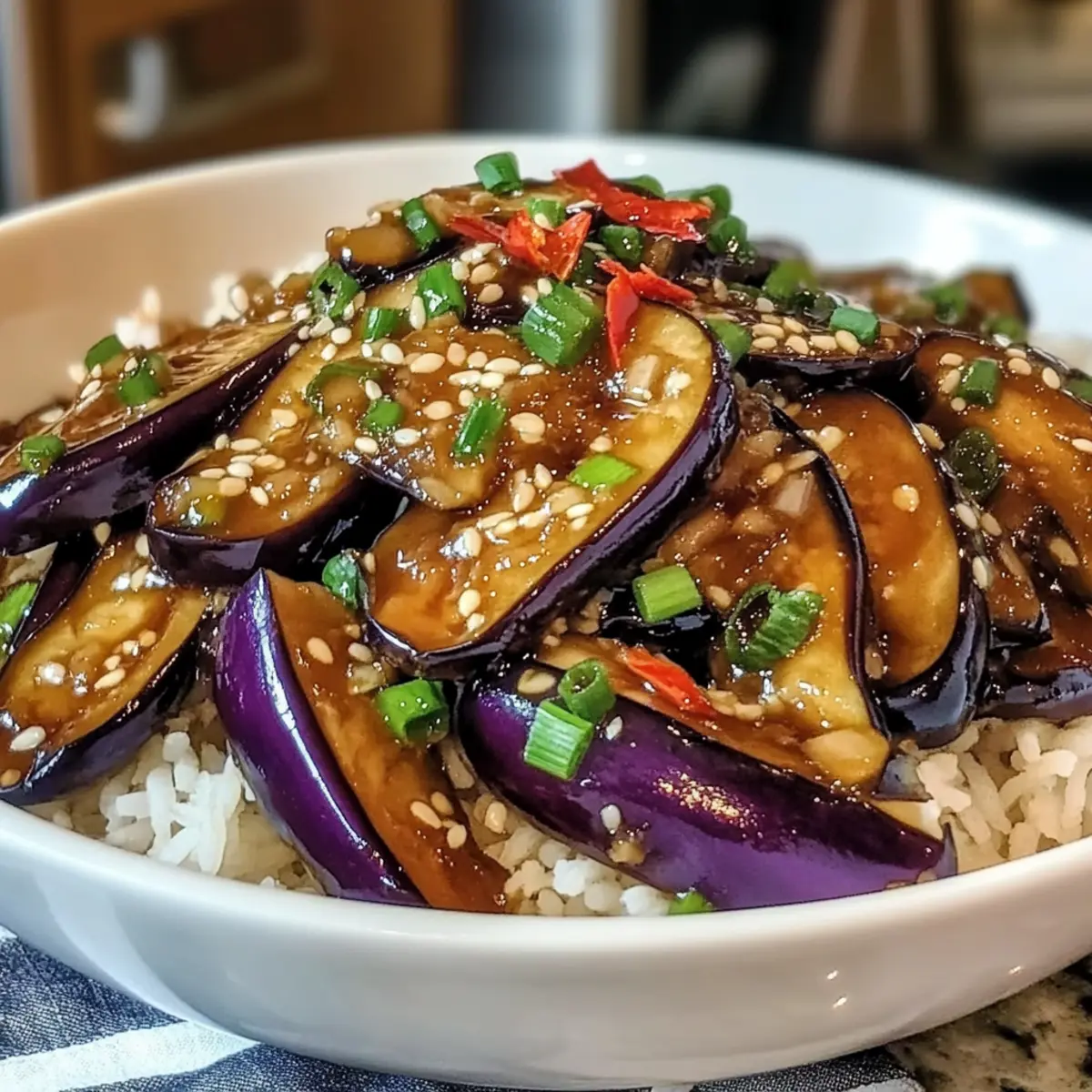 - Die Auberginenpfanne mit Chilischoten garnieren und heiß über Jasminreis servieren.