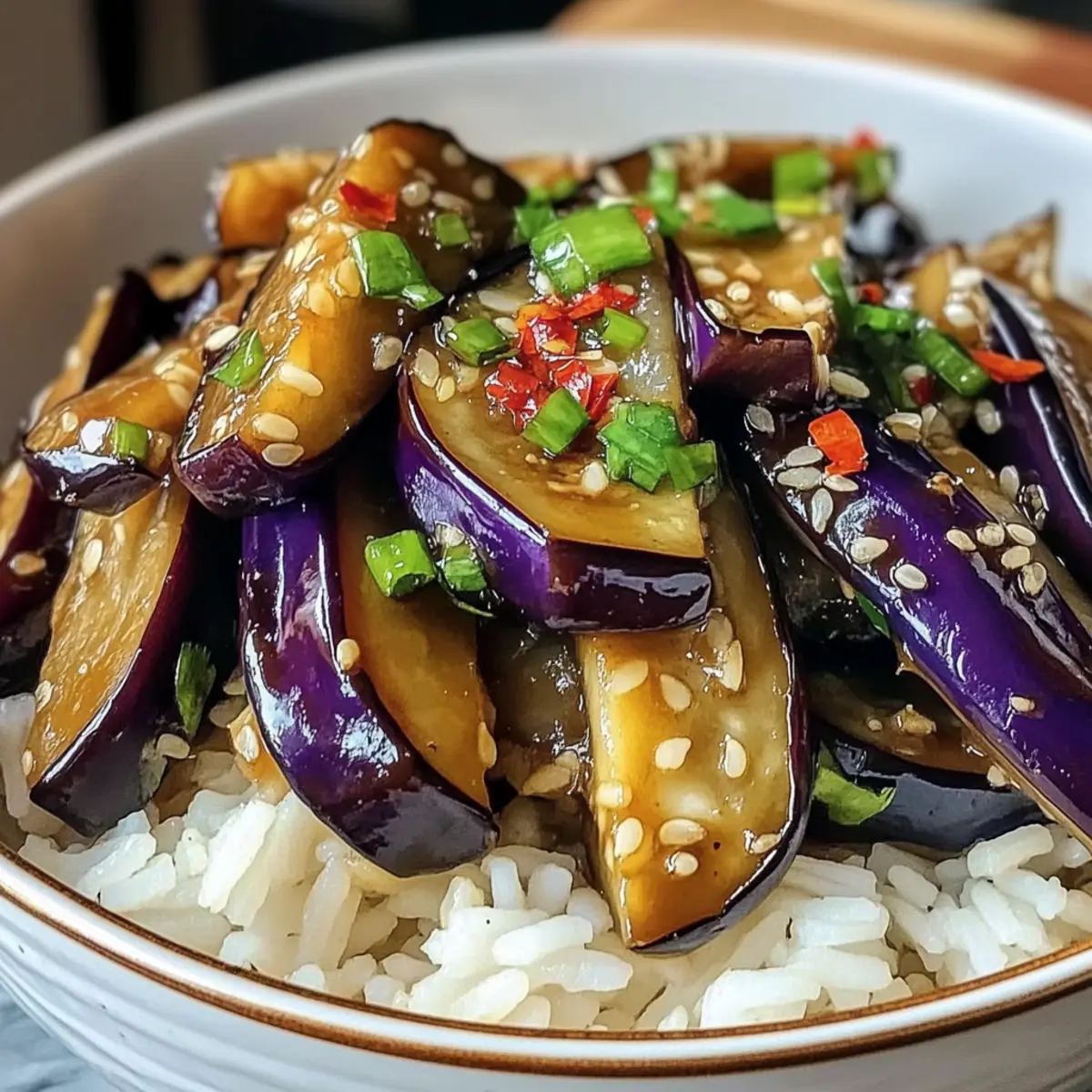 Die fertige Auberginenpfanne mit Knoblauchsauce nach Belieben mit frisch geschnittenen roten Chilischoten garnieren, um eine scharfe Note hinzuzufügen. Serviere die Pfanne heiß über dampfendem Jasminreis, um das gesamte Geschmackserlebnis zu genießen. Dies wird nicht nur sättigend sein, sondern auch deine Familie und Freunde beeindrucken!