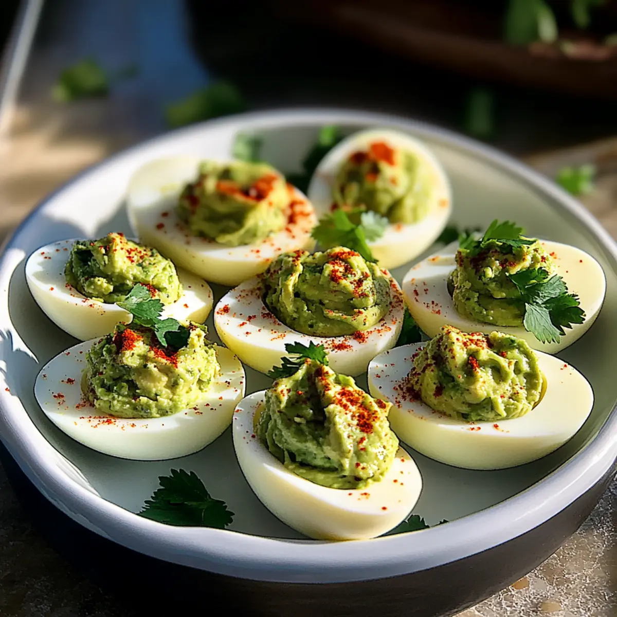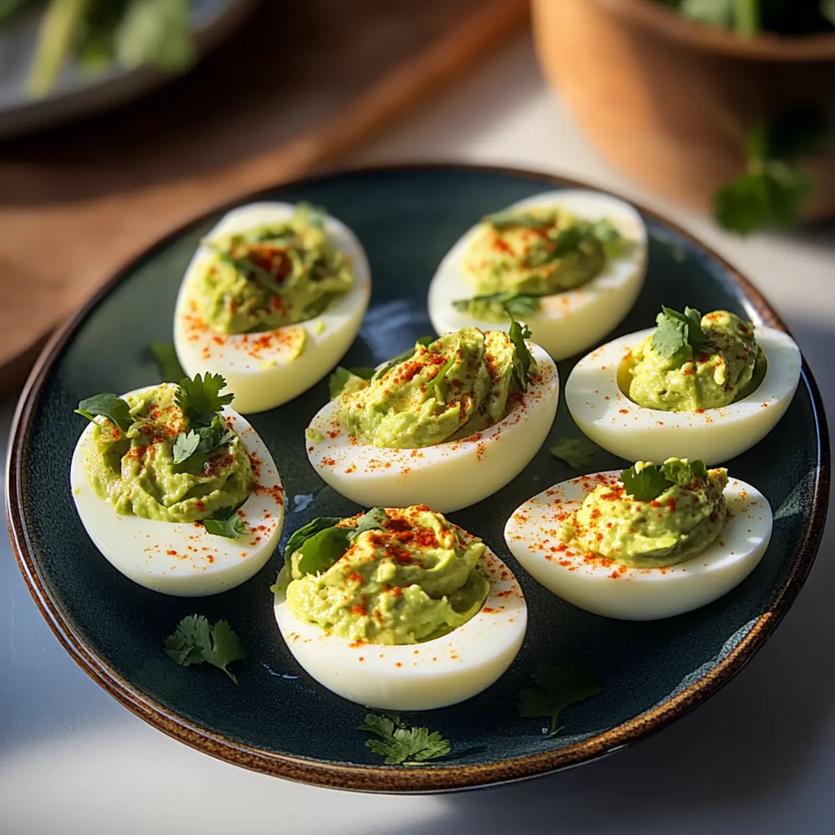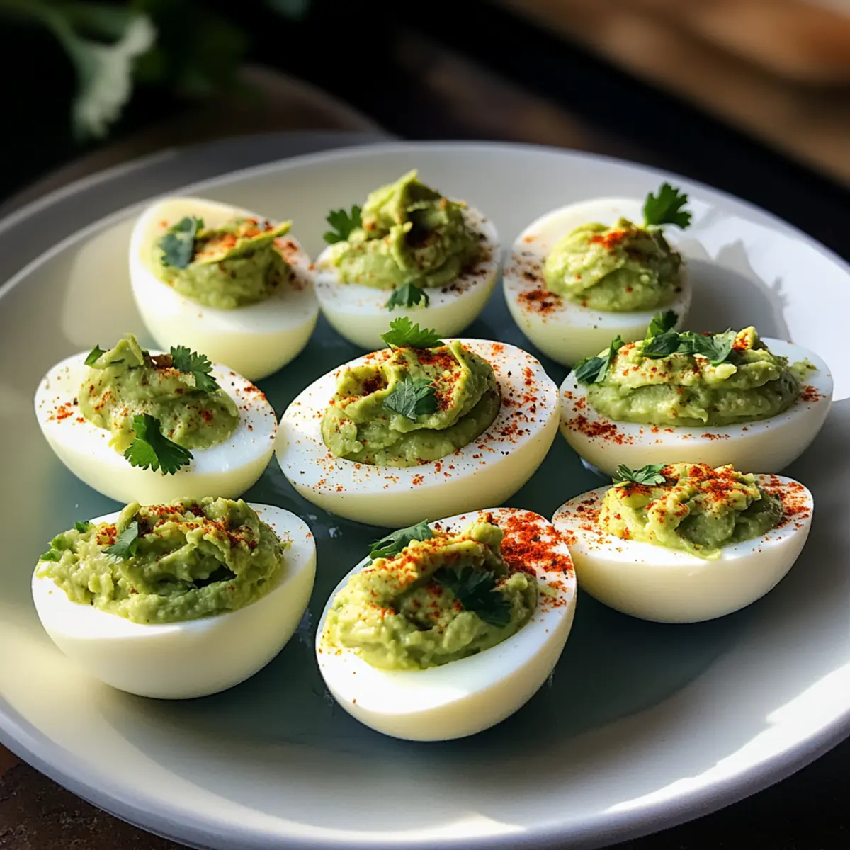 Servieren: Die Avocado gefüllten Eier sollten frisch serviert werden; erwärme sie nicht, da sie ihre Textur und ihren Geschmack am besten kalt behalten.