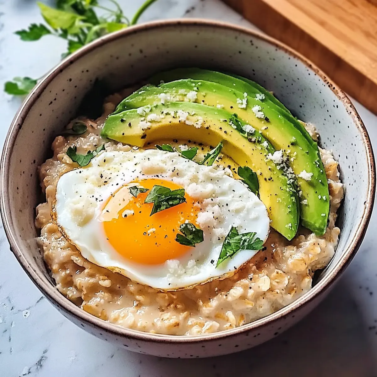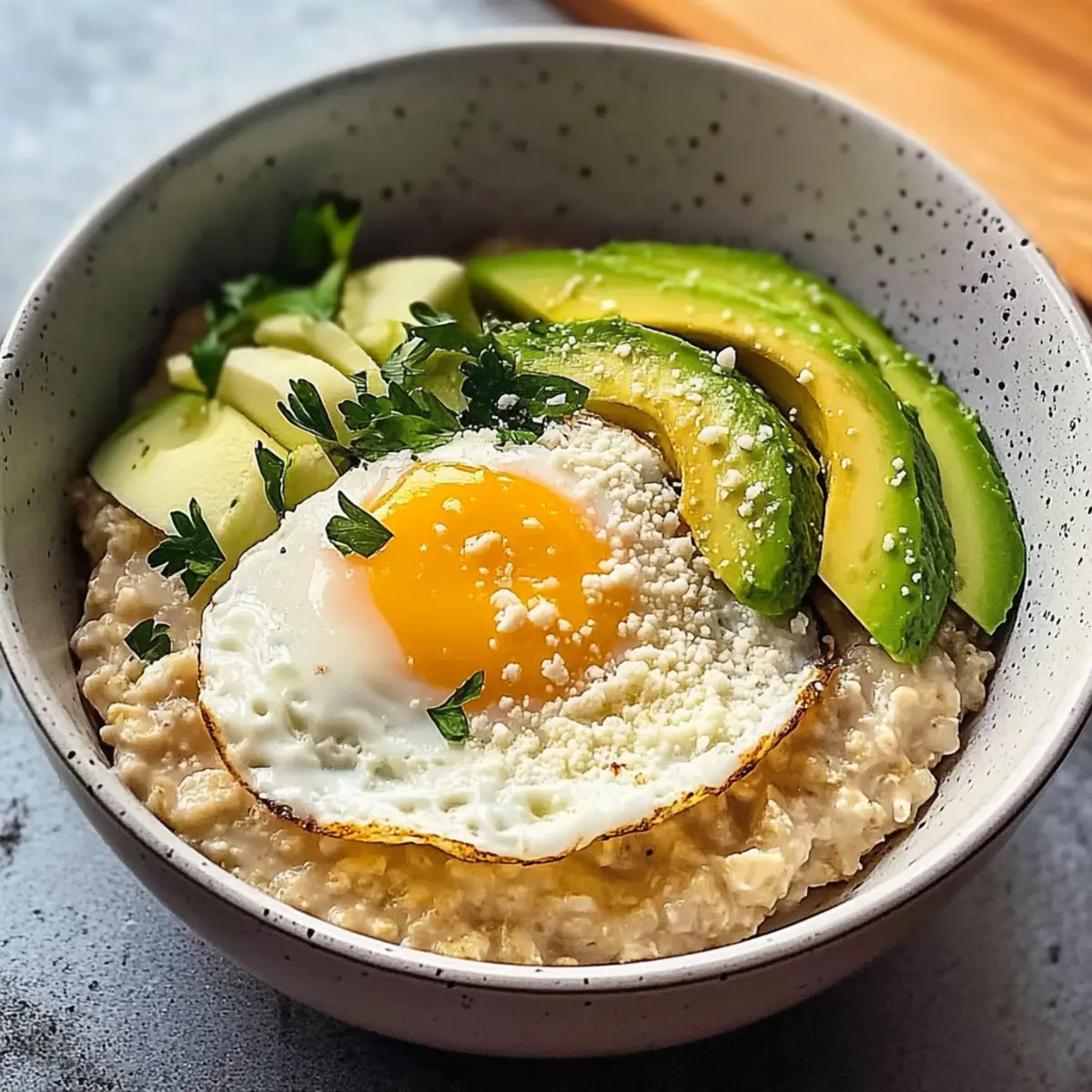 Scoop den warmen Haferbrei in eine Schüssel. Belegt ihn vorsichtig mit dem pochierten Ei und der in Scheiben geschnittenen Avocado. Für zusätzlichen Geschmack könnt ihr optional frisch geriebenen Parmesan und gehackte Petersilie darüberstreuen, was eine ansprechende, herzhafte Note verleiht.
