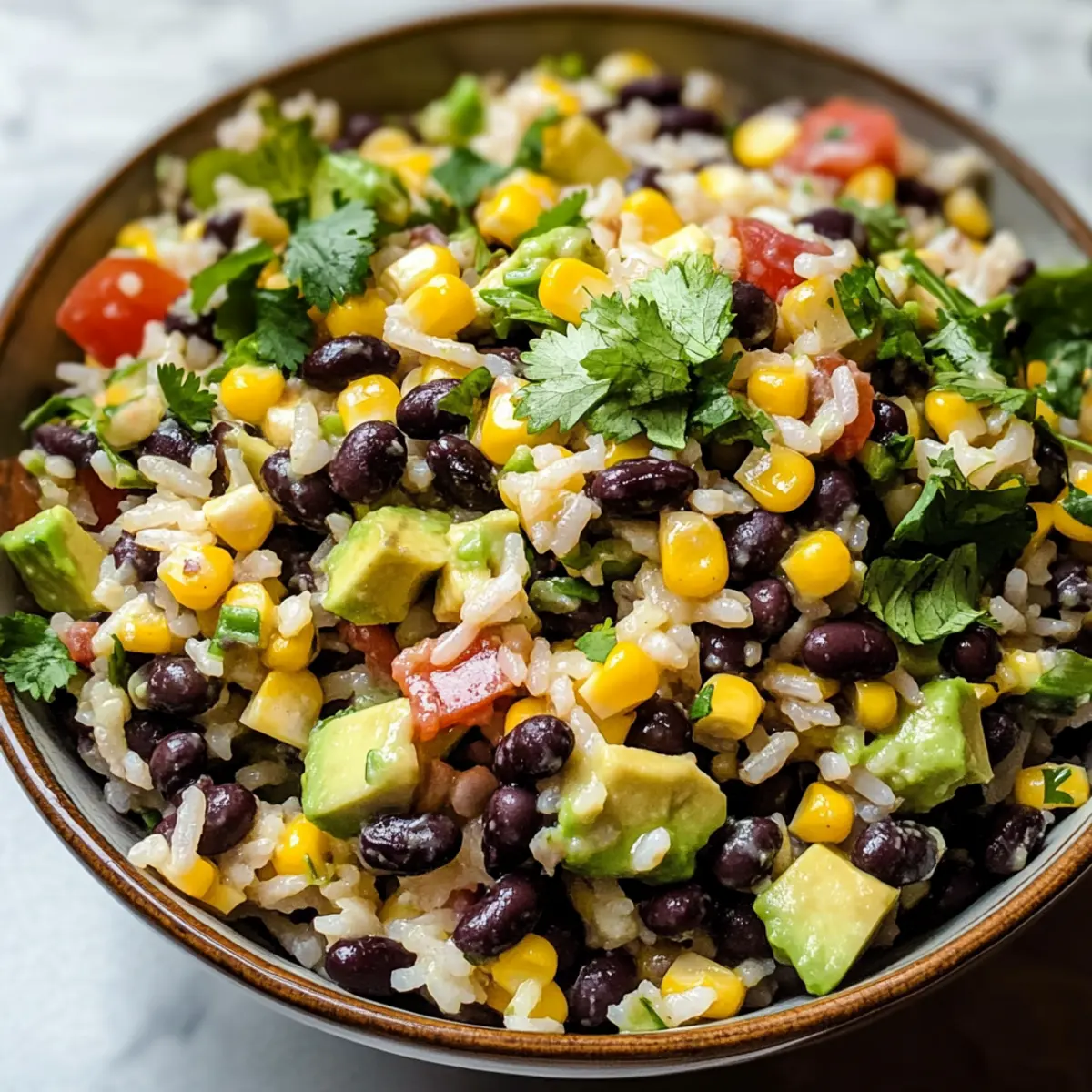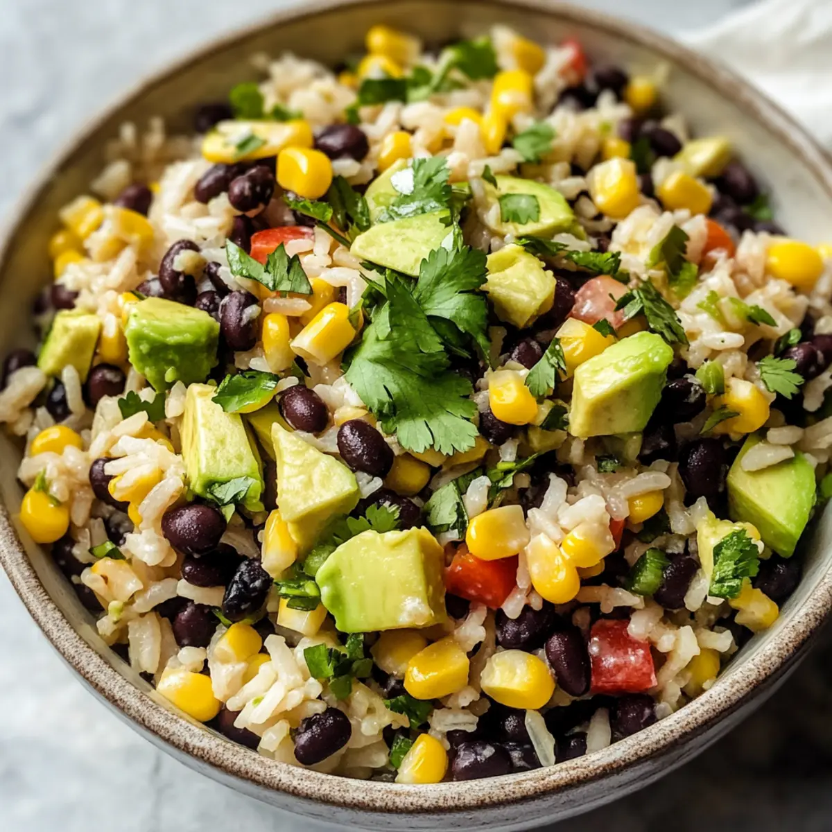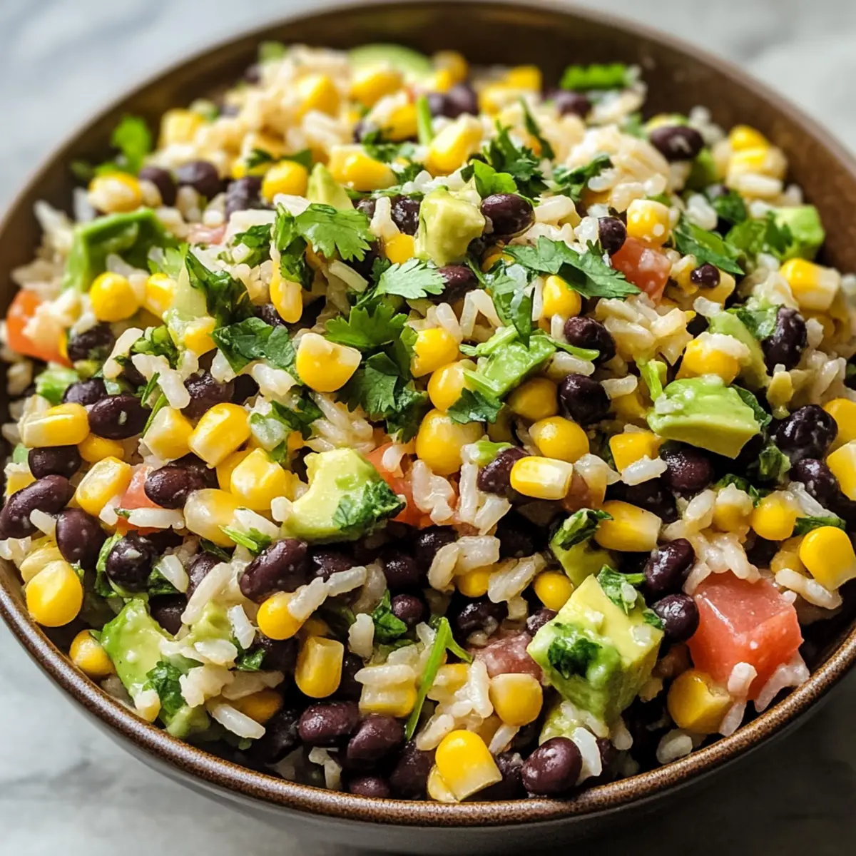 - Zutaten Kombinieren: Vermengen Sie abgekühlten Reis, schwarze Bohnen, frischen Mais, gewürfelte Avocado, rote Zwiebel und Koriander.