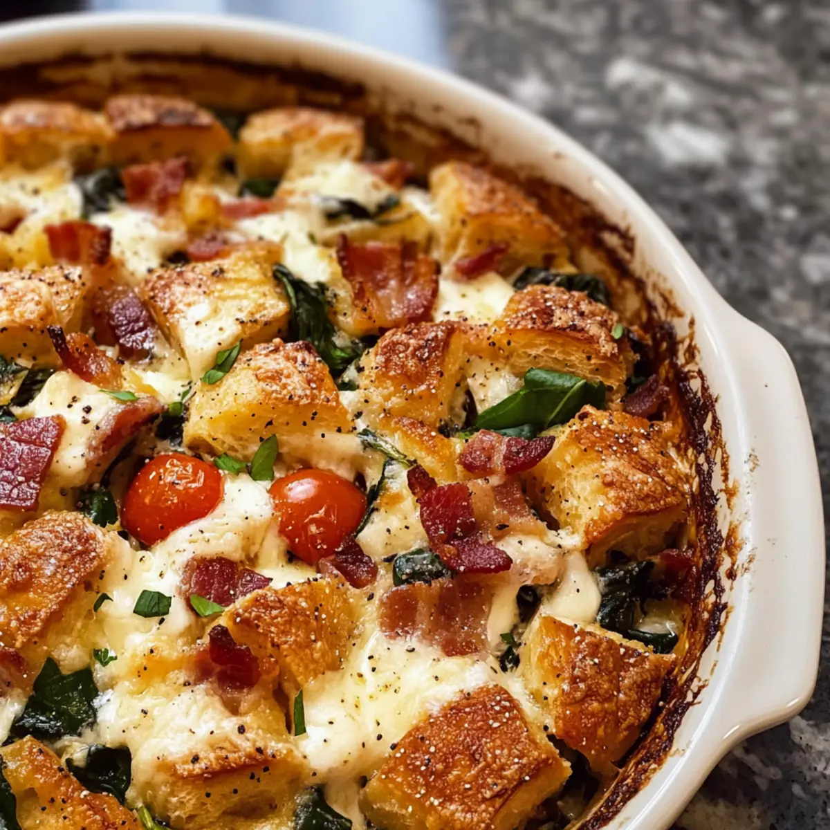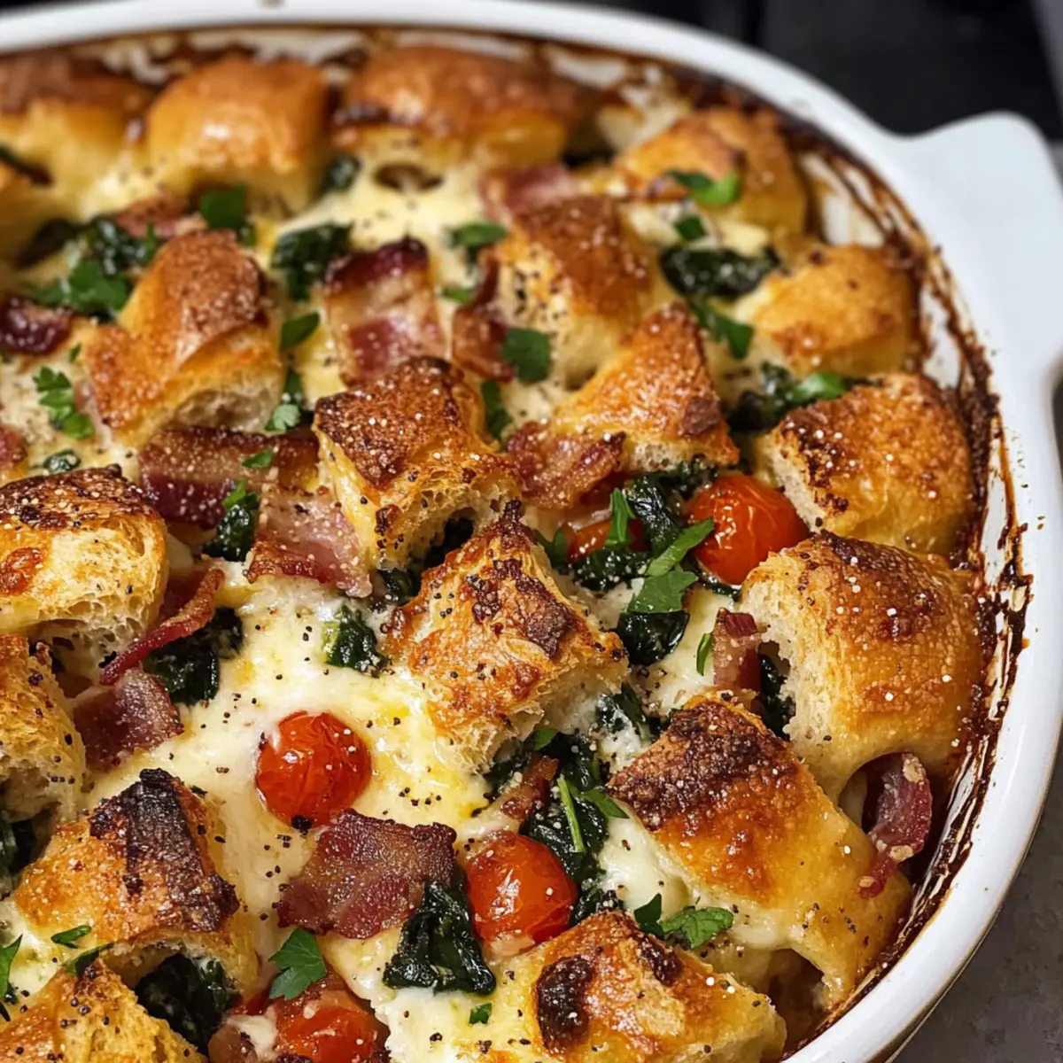 Zerreiße die Bagels grob in Stücke und gib sie in eine große Schüssel. Füge den knusprigen Bacon, die sautierten Zwiebeln und den Spinat sowie die Dosen-Tomaten hinzu. Mische alles gut durch, damit die Aromen gleichmäßig verteilt sind und die Bagelstücke die anderen Zutaten aufnehmen.