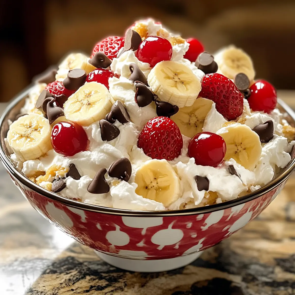 - Füge vorsichtig die Maraschino-Kirschen, gewürfelten Erdbeeren, Mini-Marshmallows, gehackte Nüsse und Schokoladenstückchen hinzu und mische alles sanft.