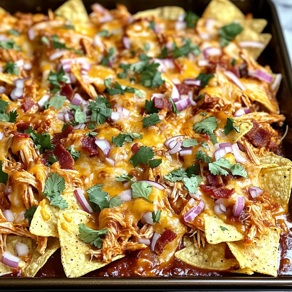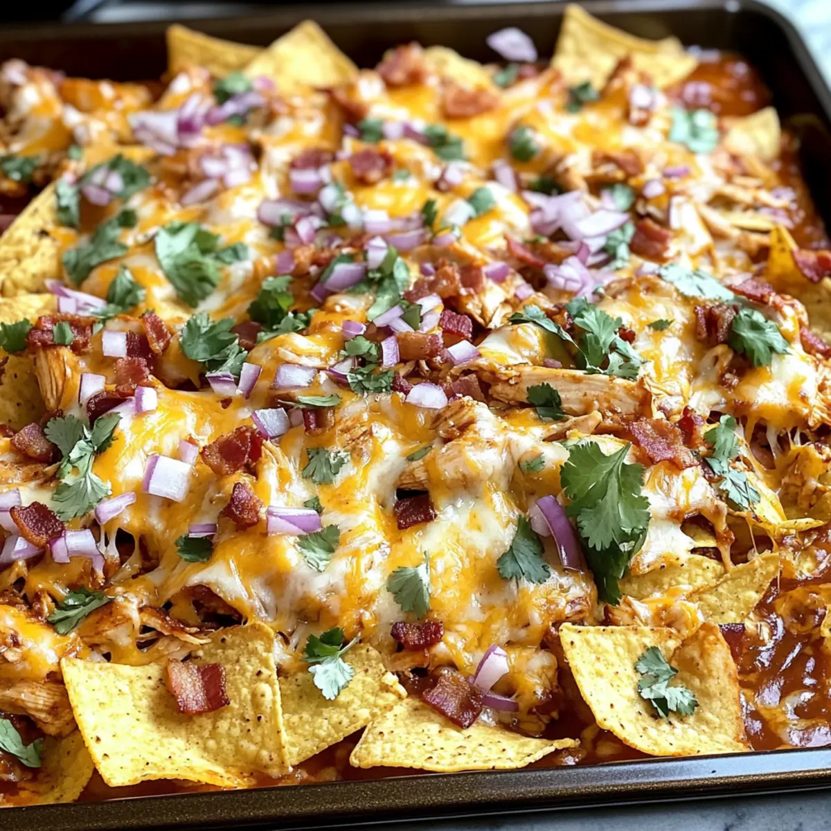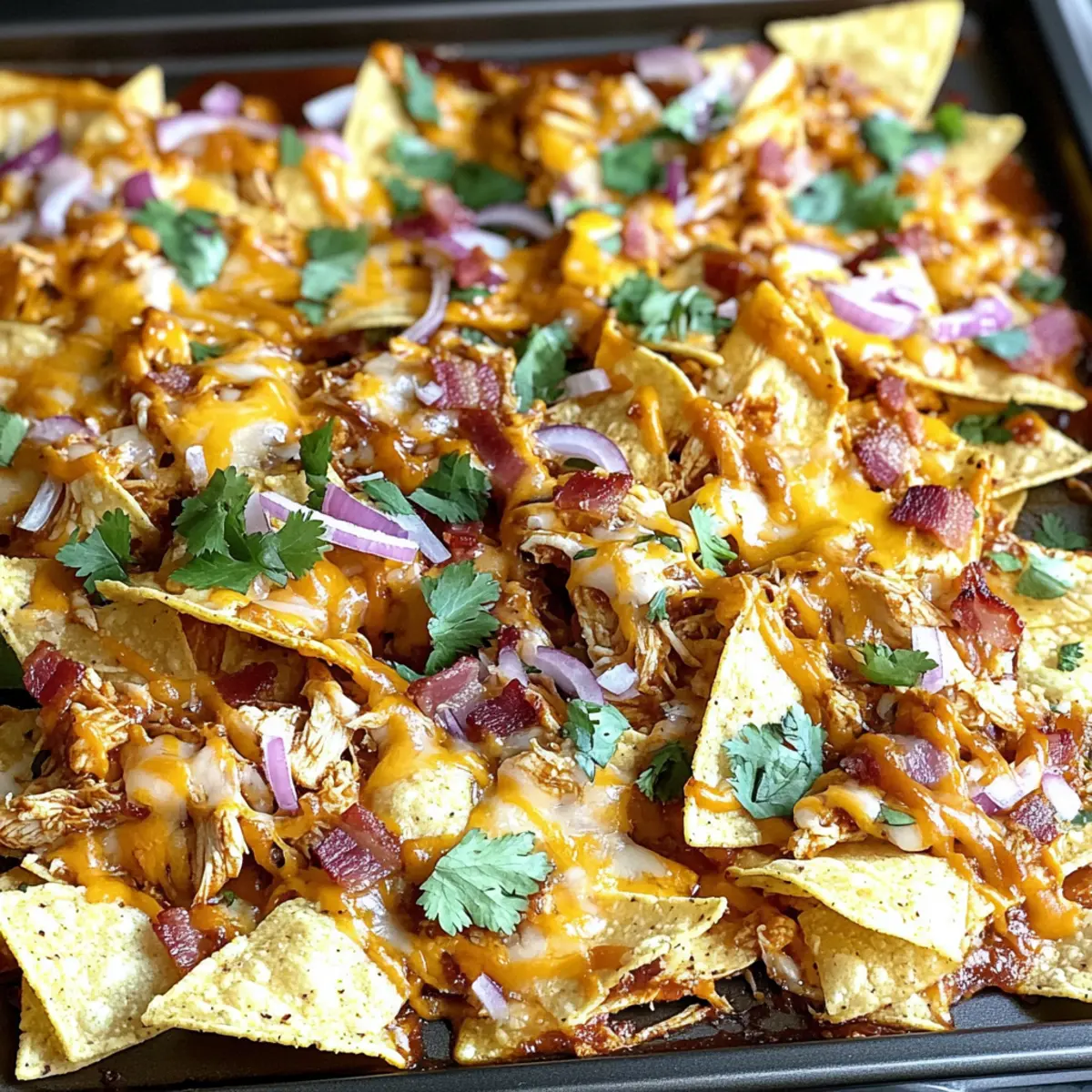 Reduziere die Ofentemperatur auf 160°C (325°F). Lege eine Schicht stabiler Tortilla-Chips auf ein sauberes Backblech. Belege die Chips gleichmäßig mit der BBQ-Hühnchen-Mischung, dann verteile die geriebenen Käsesorten und die dünn geschnittene rote Zwiebel darüber.