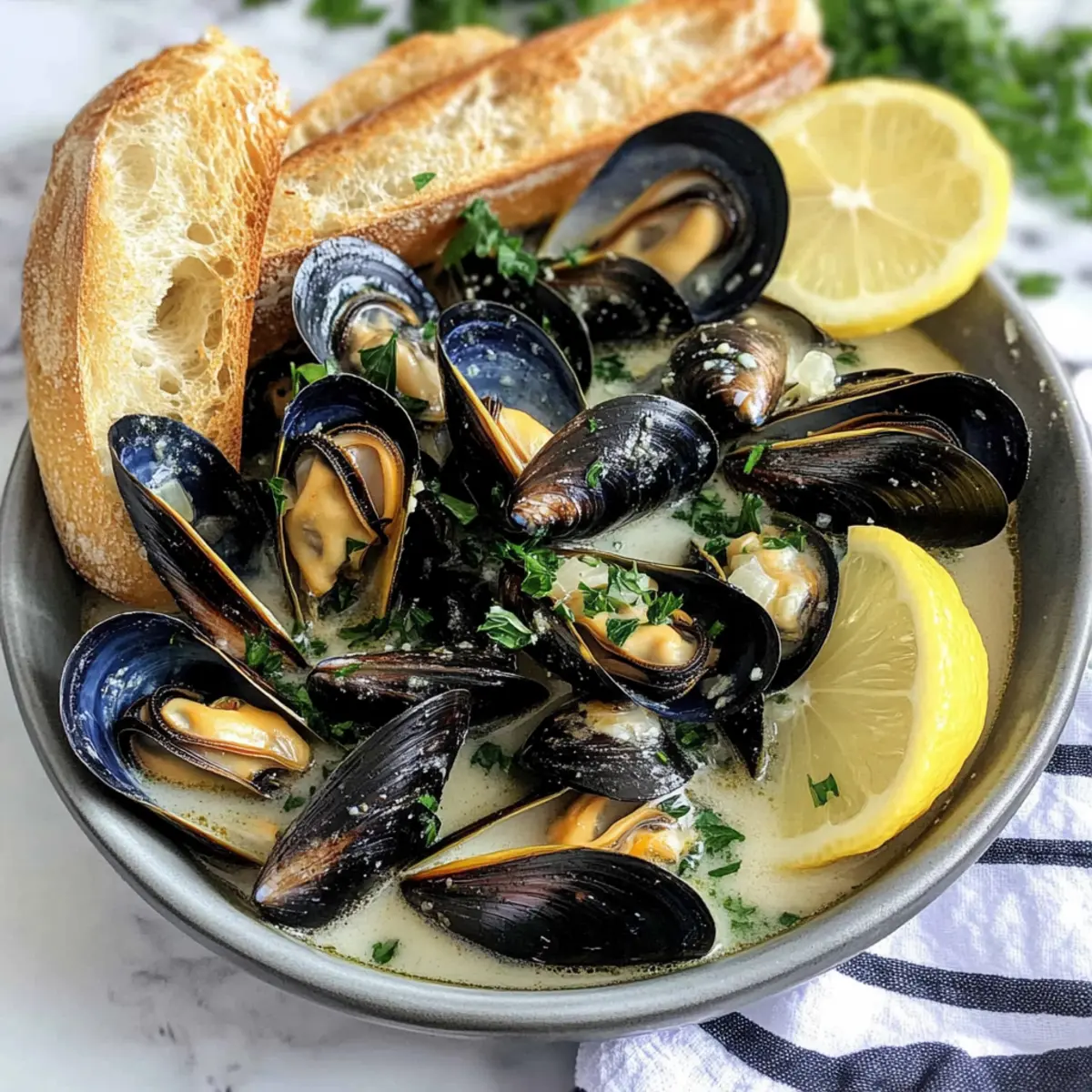 Knuspriges Baguette: Perfekt zum Eintunken in die aromatische Sauce. Die Kombination aus knuspriger Kruste und saftigen Muscheln sorgt für einen tollen Kontrast.