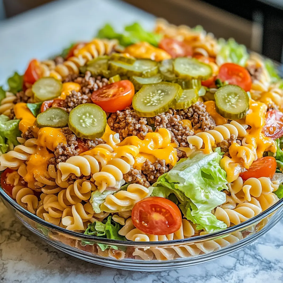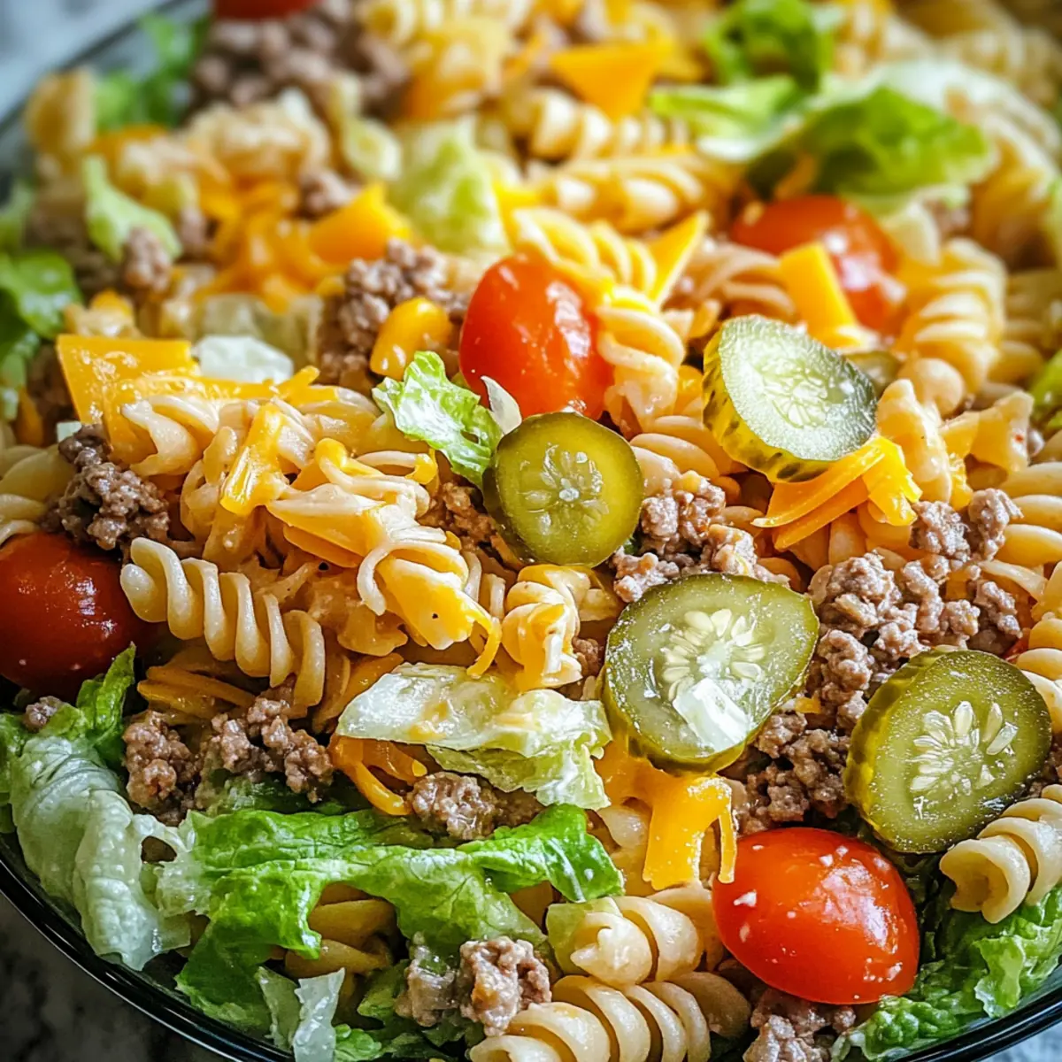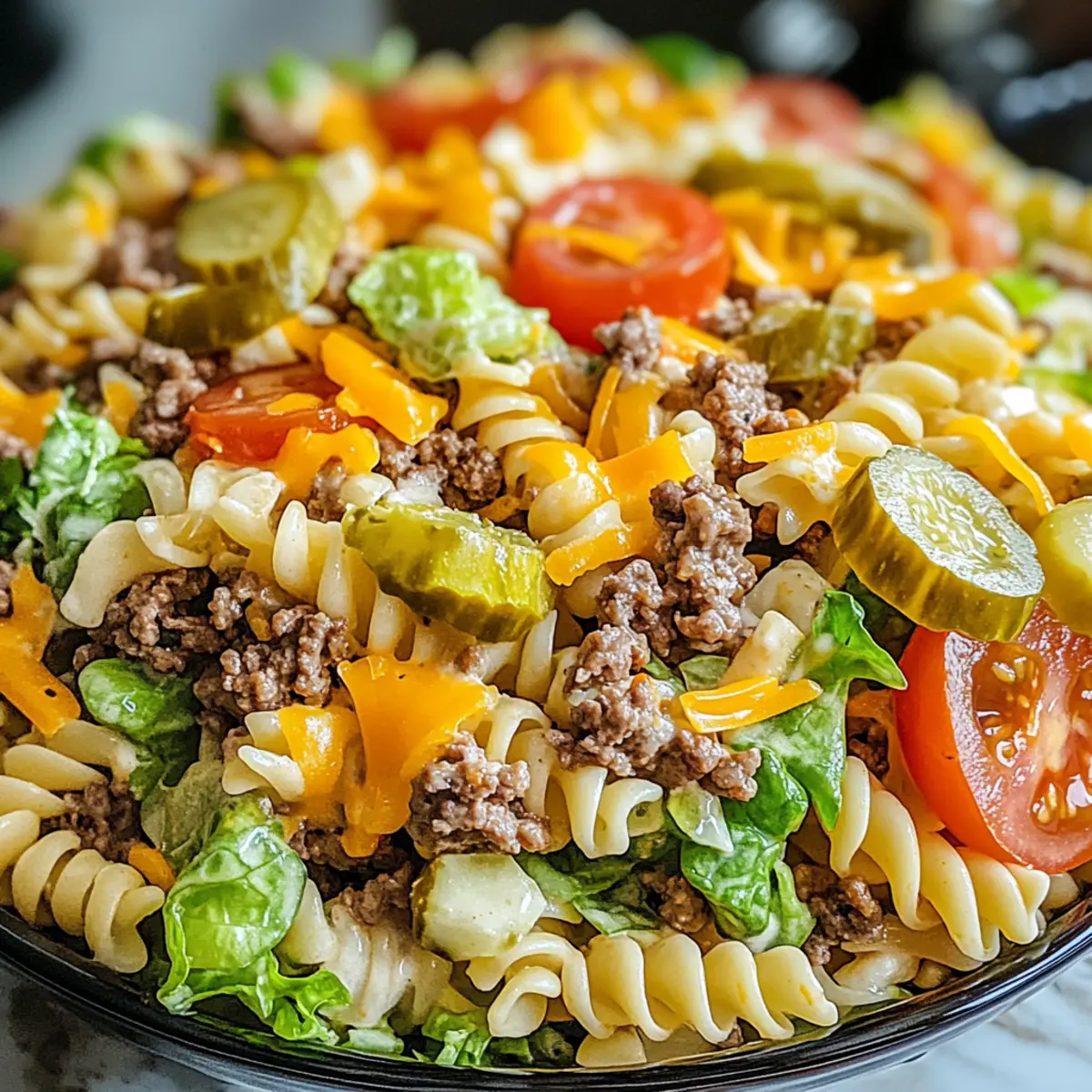 Einzigartiger Geschmack: Die Big Mac Pasta Salad bringt die ikonischen Aromen eines Big Mac direkt auf deinen Tisch – eine perfekte Mischung aus saftigem Rinderhack und frischem Gemüse.