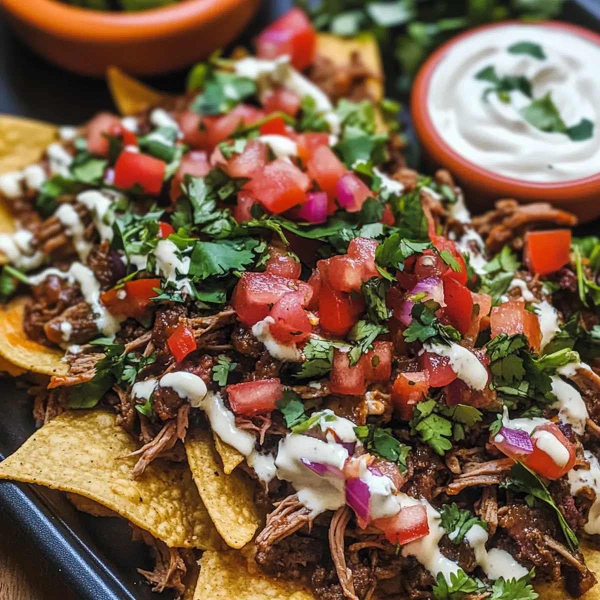Nimm die Birria Nachos aus dem Ofen und garniere sie großzügig mit den eingelegten Zwiebeln, Pico de Gallo, frischem Koriander und einem großzügigen Klecks Chipotle-Sauerrahm. Serviere die Nachos heiß mit frischen Limettenspalten, um die Aromen zu intensivieren.