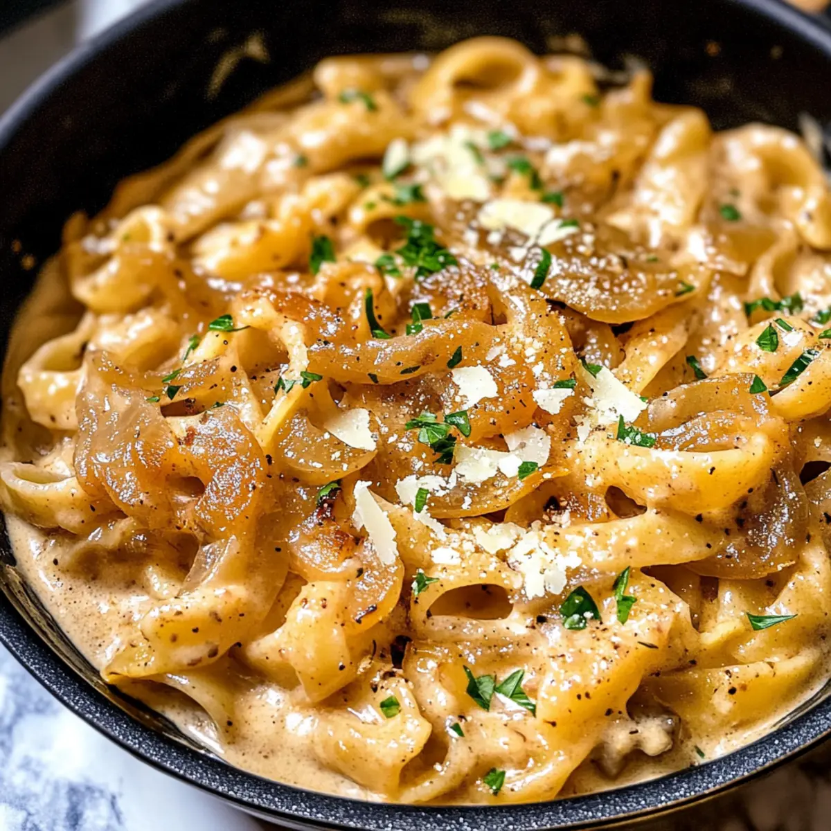 Ein Topf Französische Zwiebel Pasta für Genießer