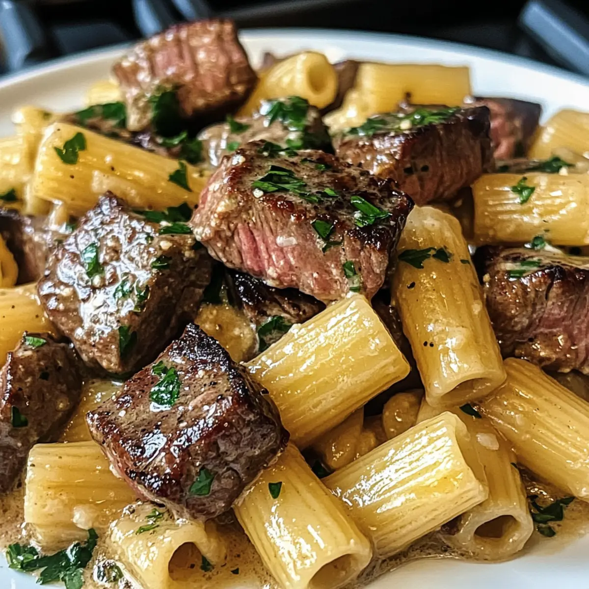 Knoblauchbutter-Steakspitzen mit Käse-Rigatoni