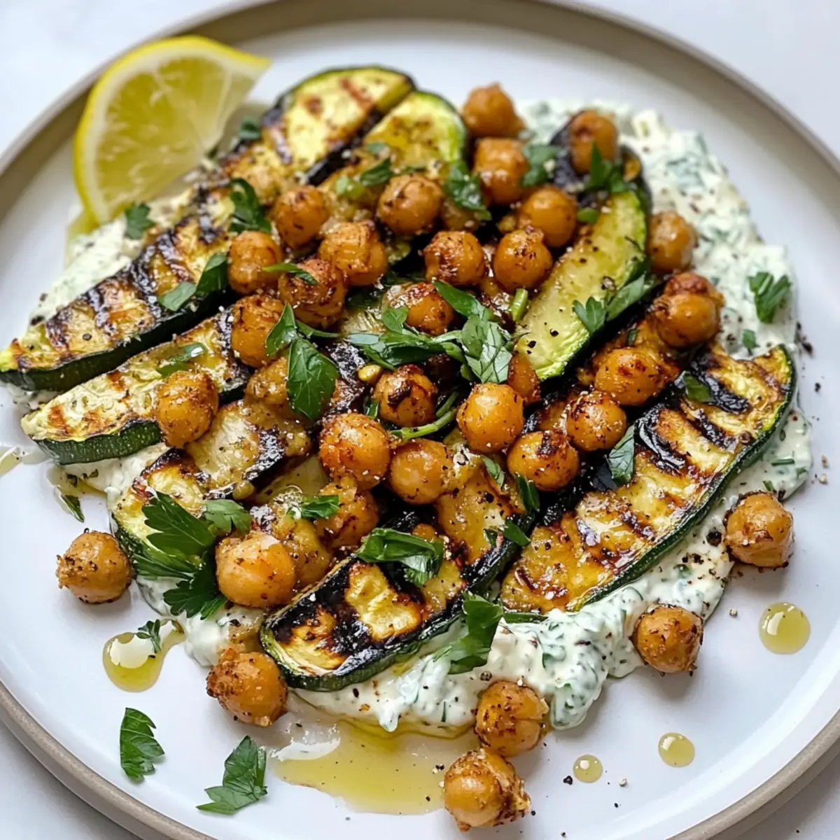 Zitronige gegrillte Zucchini mit knusprigen Kichererbsen