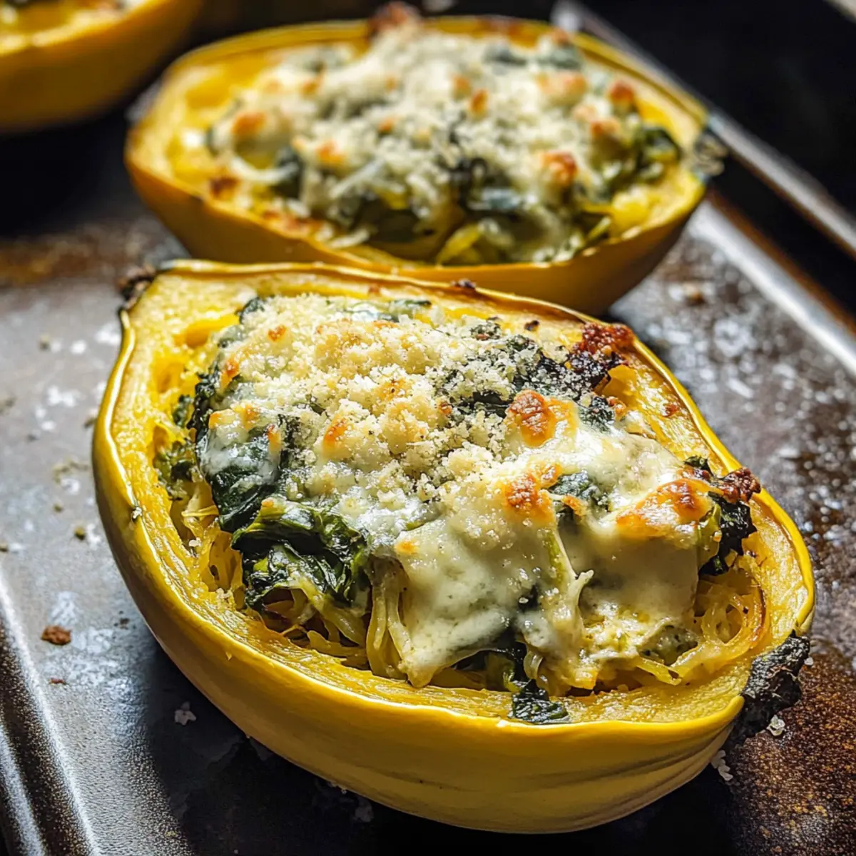 Spinat und Artischocken im gefüllten Spaghetti-Kürbis