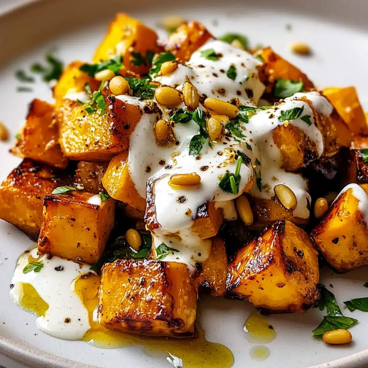 Gerösteter Kürbis mit Joghurt und Pinienkernen