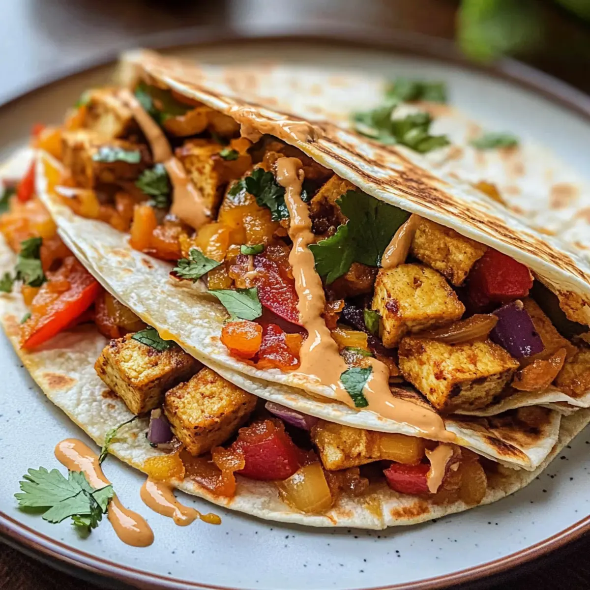 Wärme die Tortillas in einer trockenen Pfanne für 30 Sekunden auf jeder Seite, um sie biegsam zu machen. Verteile eine großzügige Menge der Chipotle-Mayo auf jeder Tortilla, füge dann die knusprigen Tofustücke und das sautierte Gemüse hinzu. Klappe die Tortilla über die Füllung und brate sie in derselben Pfanne, bis sie goldbraun und leicht knusprig ist, etwa 2-3 Minuten pro Seite.