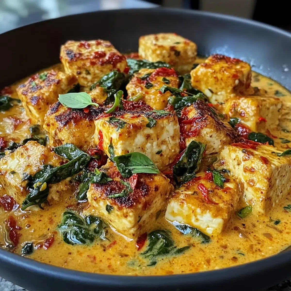 Gemütlicher Genuss: Der cremige Tofu ist der perfekte Ersatz für jeden, der sich nach wohltuenden, herzhaften Speisen sehnt – ideal für ein gemeinsames Abendessen mit Freunden oder der Familie.