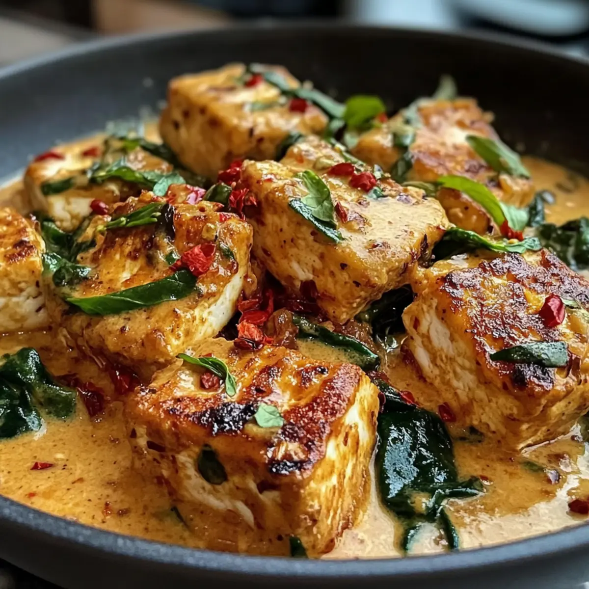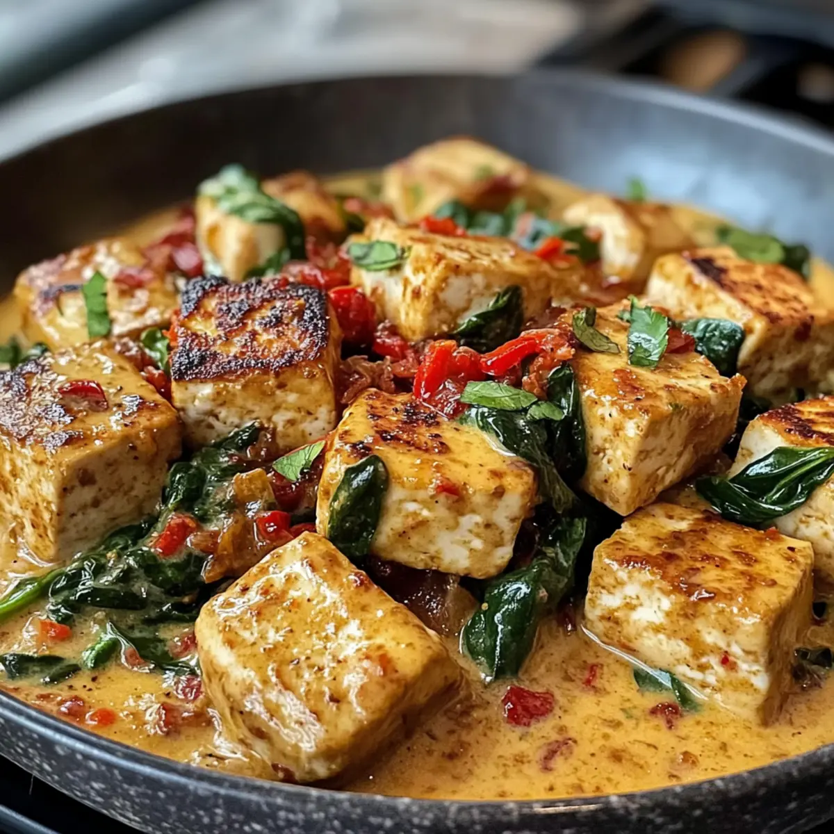 Nachdem die Soße gut eingekocht ist, füge den vorbereiteten Tofu hinzu. Lasse ihn für etwa 5–7 Minuten in der Soße köcheln, damit er die Aromen aufnehmen kann. Wende den Tofu vorsichtig mit einem Holzlöffel, um sicherzustellen, dass alle Seiten gut mit der cremigen Soße überzogen sind.