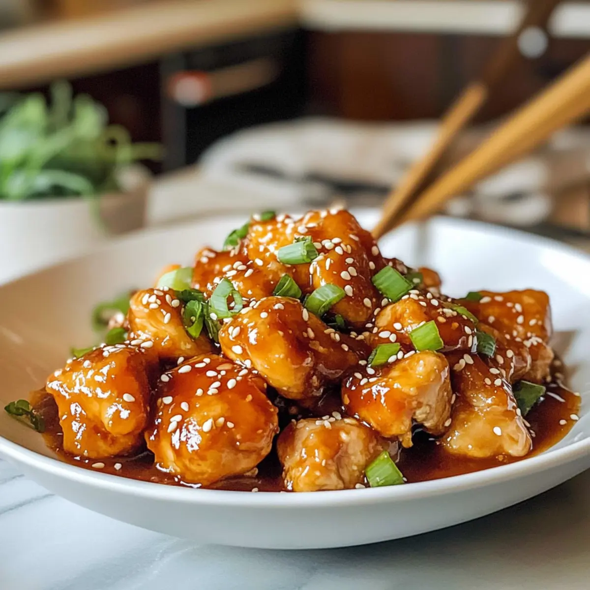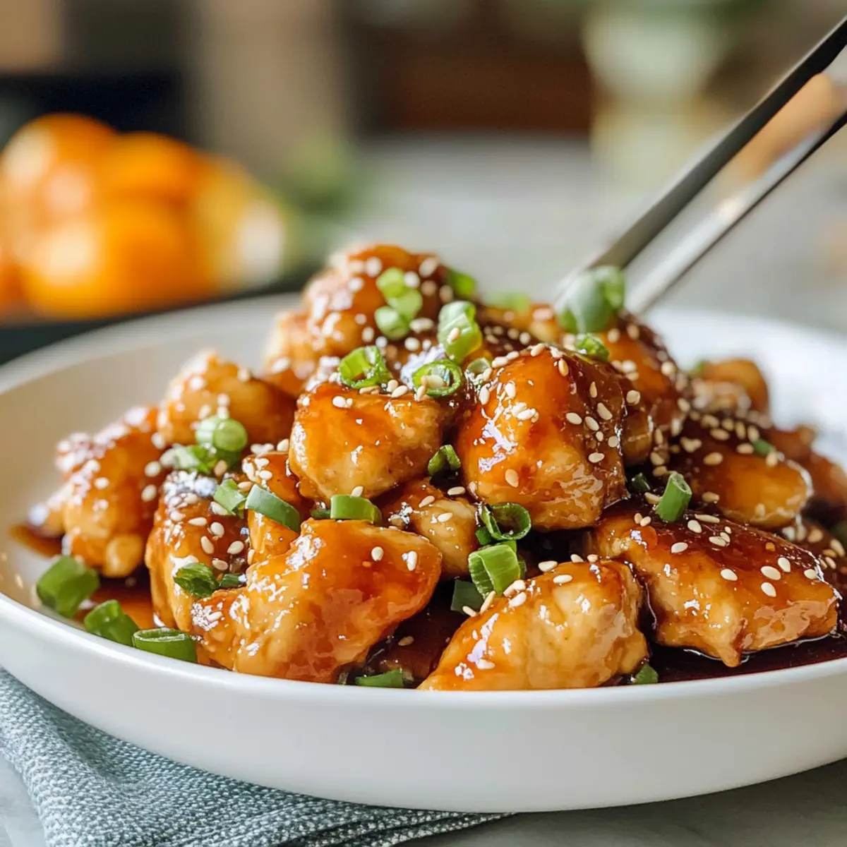- Anrichten und servieren: Garniere das Huhn mit Sesamsamen und Frühlingszwiebeln und serviere es.