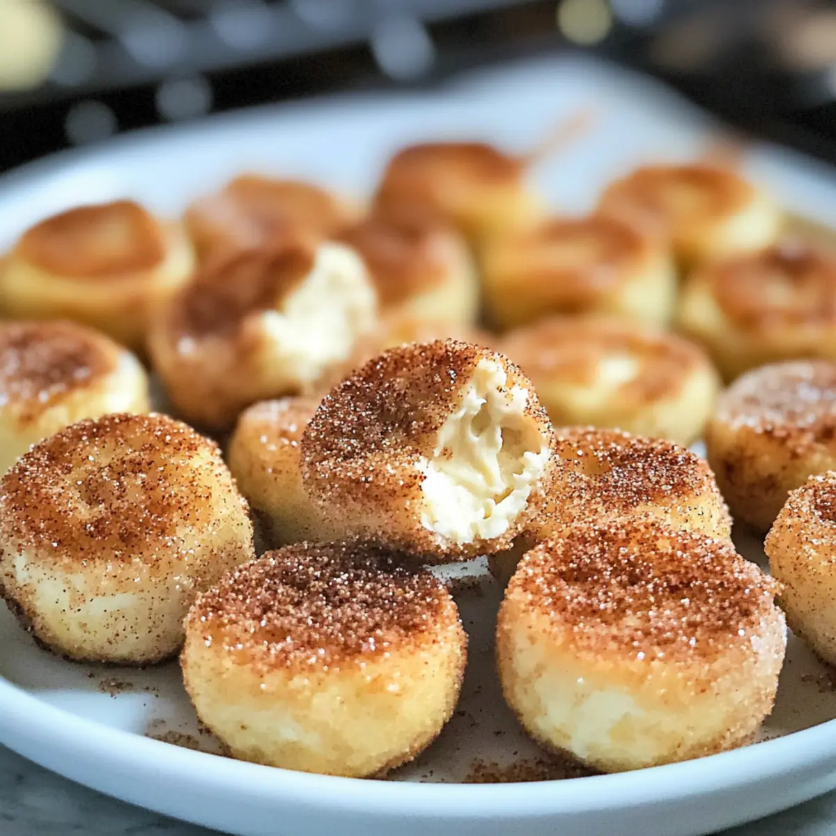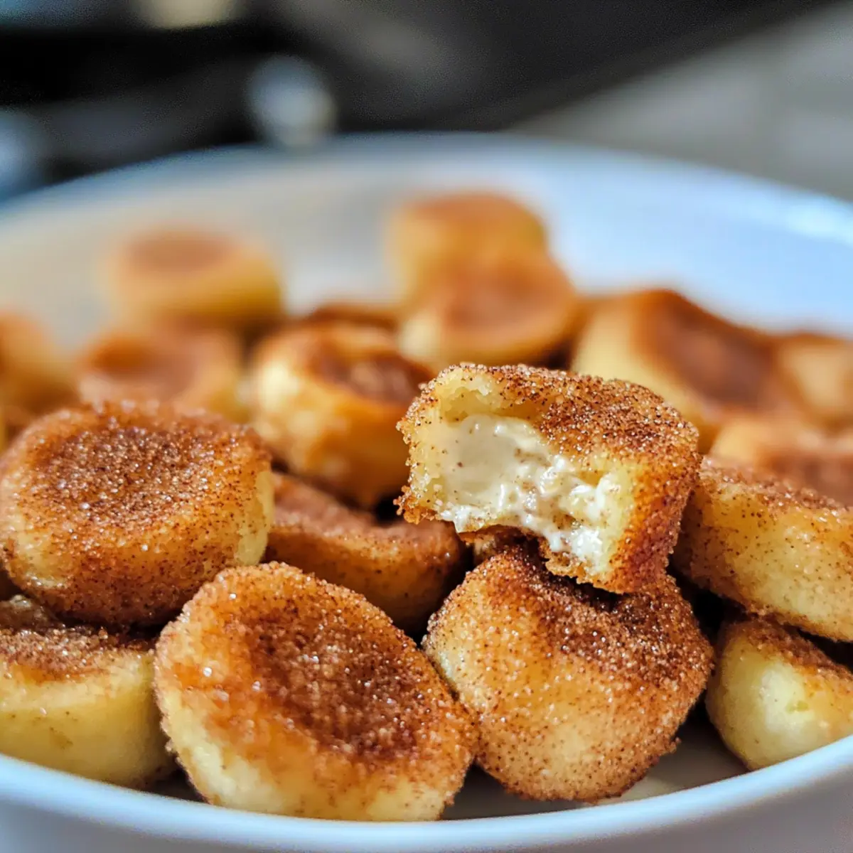 Sobald die Frischkäse-Häppchen goldbraun und knusprig sind, nimm sie aus der Pfanne und bestreue sie sofort mit der Zimt-Zucker-Mischung. Lass sie kurz abkühlen und serviere sie warm als köstlichen Snack oder süßes Dessert.