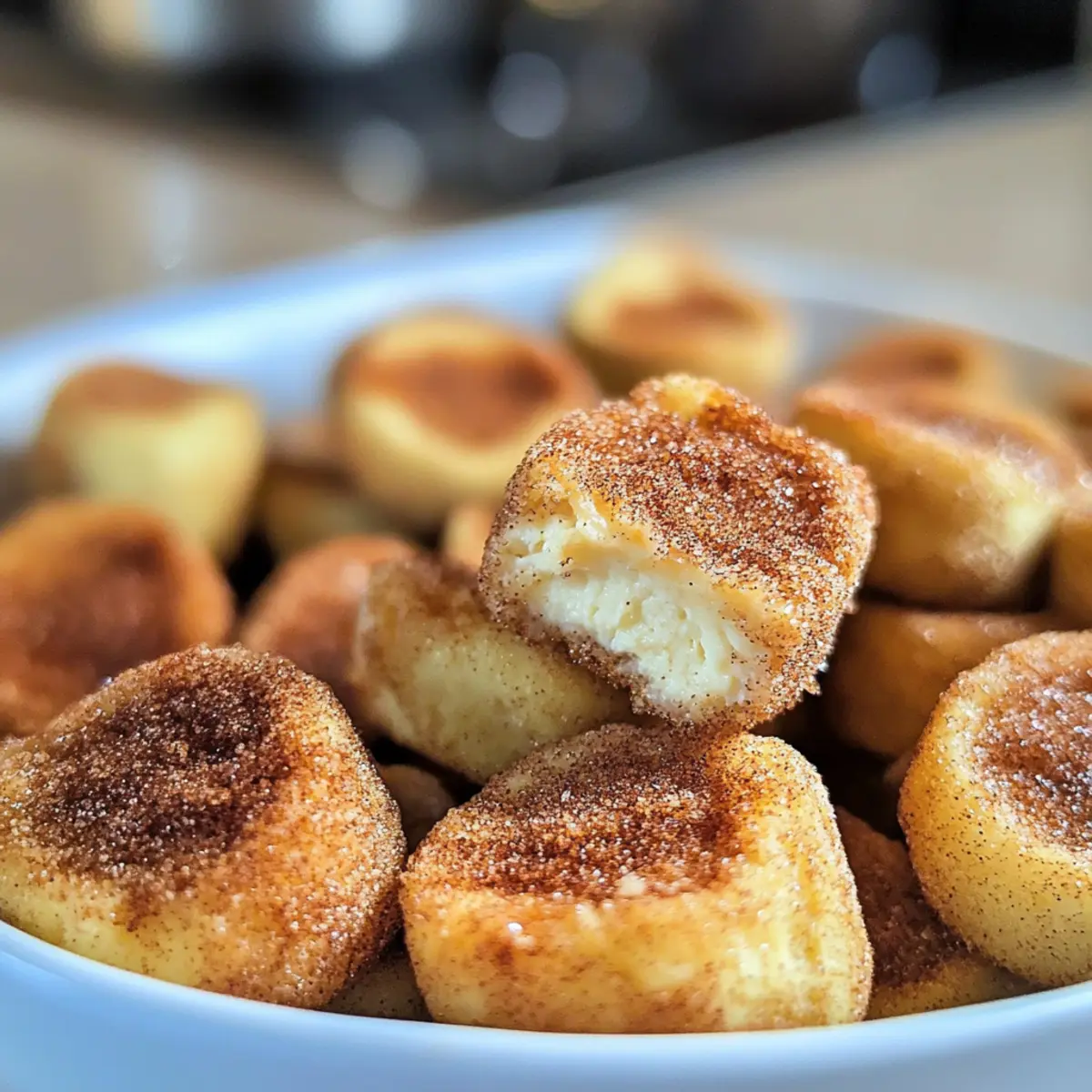 Während die Häppchen braten, mische in einer kleinen Schüssel den Swerve Granulierter Zucker Ersatz und den restlichen Zimt. Diese Mischung wird über die frisch gebratenen Frischkäse-Häppchen gestreut, um ihnen das perfekte süße Finish zu verleihen.