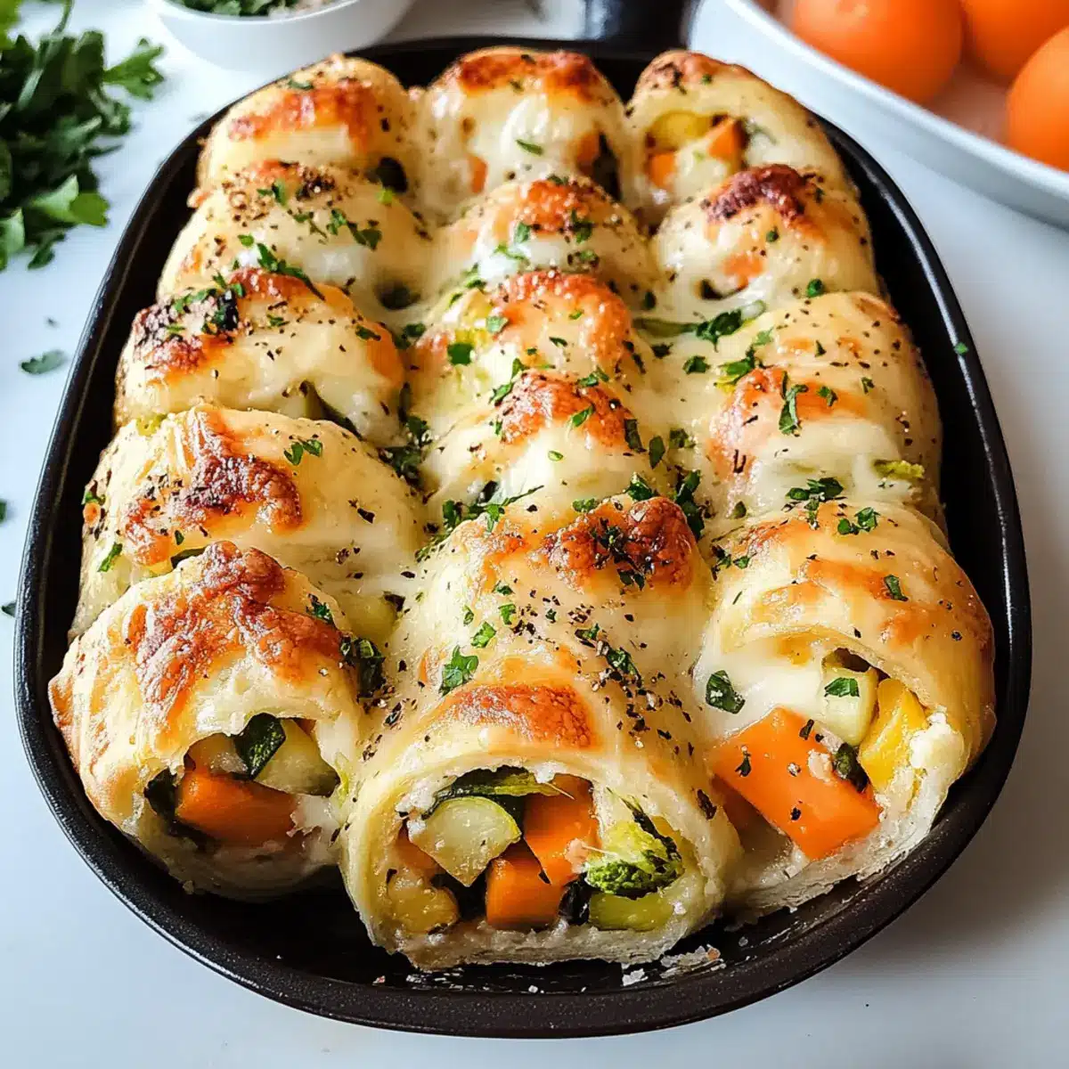 Die Gebratene Gemüse-Rollen sind perfekt für die Vorbereitung im Voraus! Sie können den Teig und die Füllung bis 24 Stunden vor dem Backen zubereiten. Mischen Sie den Teig aus Mehl, Backpulver, Olivenöl und Wasser und bewahren Sie ihn in Frischhaltefolie im Kühlschrank auf. Ebenso können Sie die Füllung (Käse und Gemüse) vorbereiten und in einem luftdichten Behälter aufbewahren. Um die Qualität zu erhalten, lagern Sie alle Zutaten getrennt und rollen Sie die Röllchen erst kurz vor dem Backen. Wenn Sie bereit sind, einfach die Röllchen aufschneiden, mit geschmolzener Butter bestreichen und im vorgeheizten Ofen für 20-25 Minuten backen, um köstliche, leicht zubereitete Snacks zu genießen!