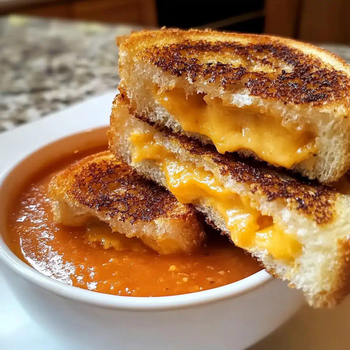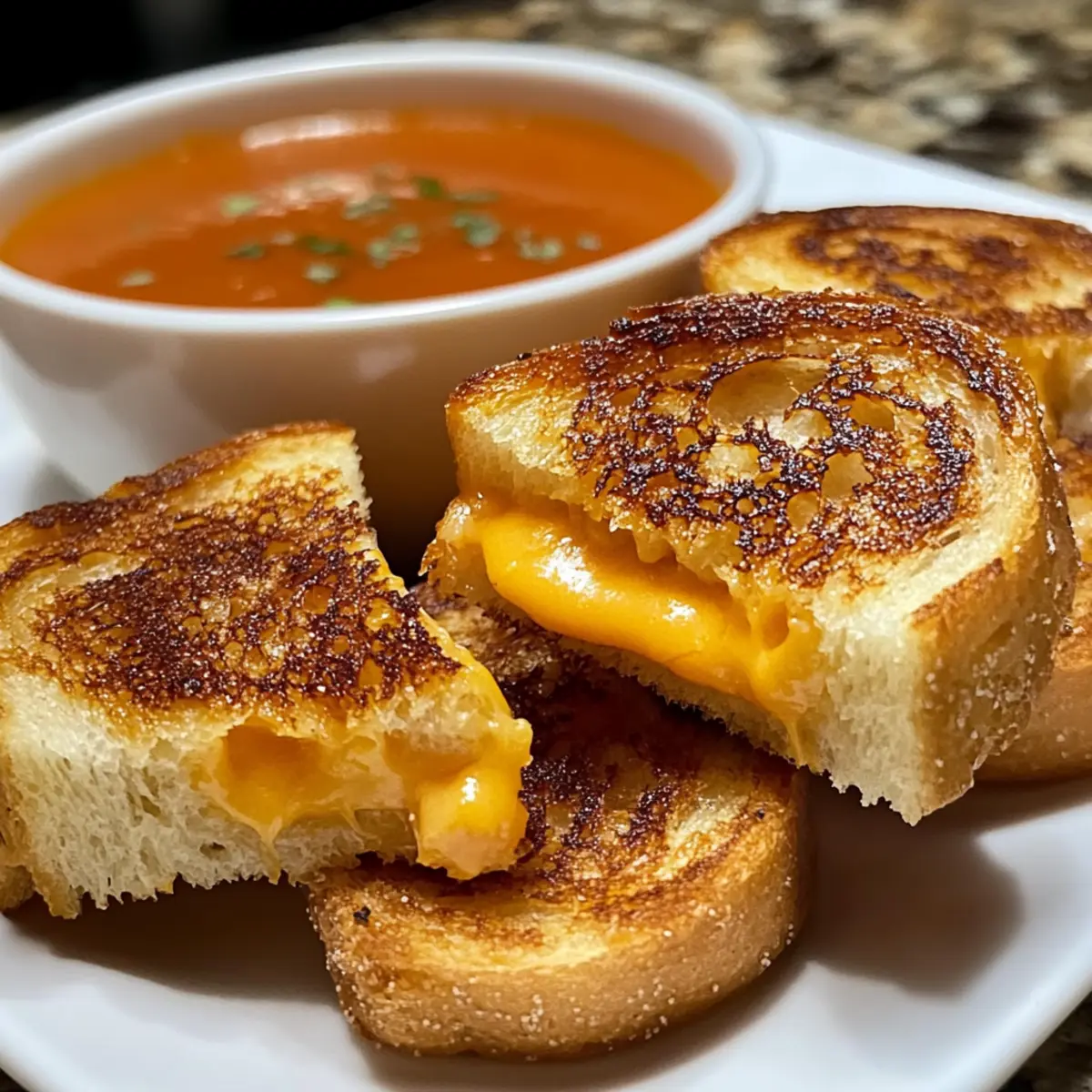 Cremige Tomatensuppe: Perfekt zum Eintauchen, bringt die Süße der Tomaten eine harmonische Balance zum herzhaften Käse.