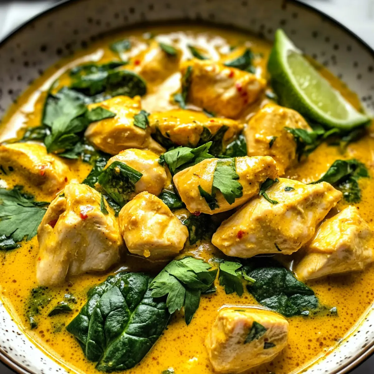 - Spinat hinzufügen: Spinat in das Curry geben und 1-2 Minuten köcheln lassen, Limettensaft hinzufügen und abschmecken.