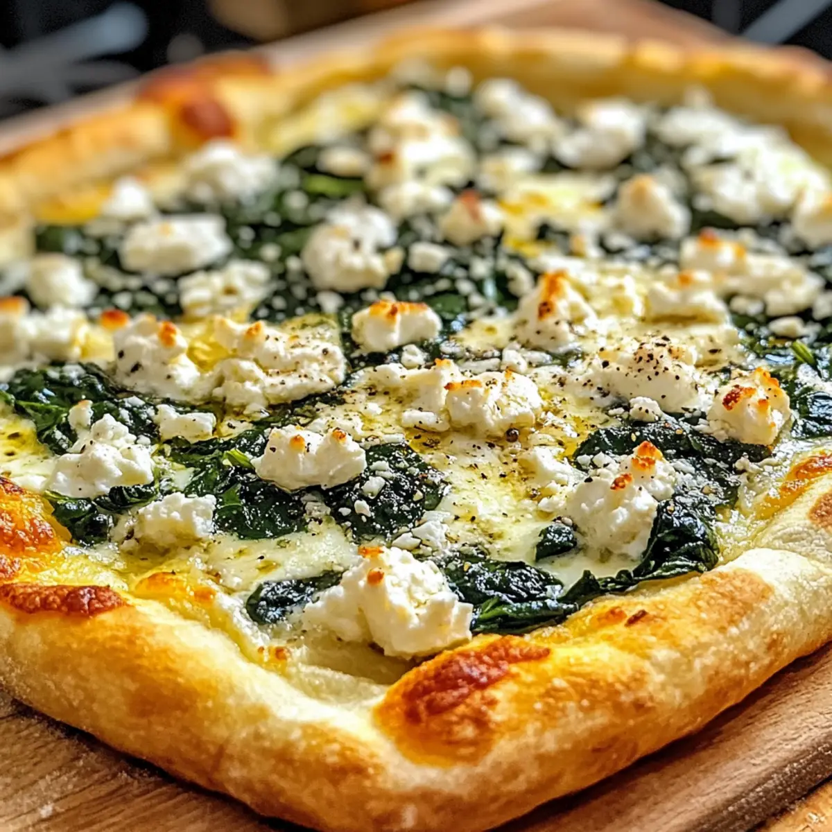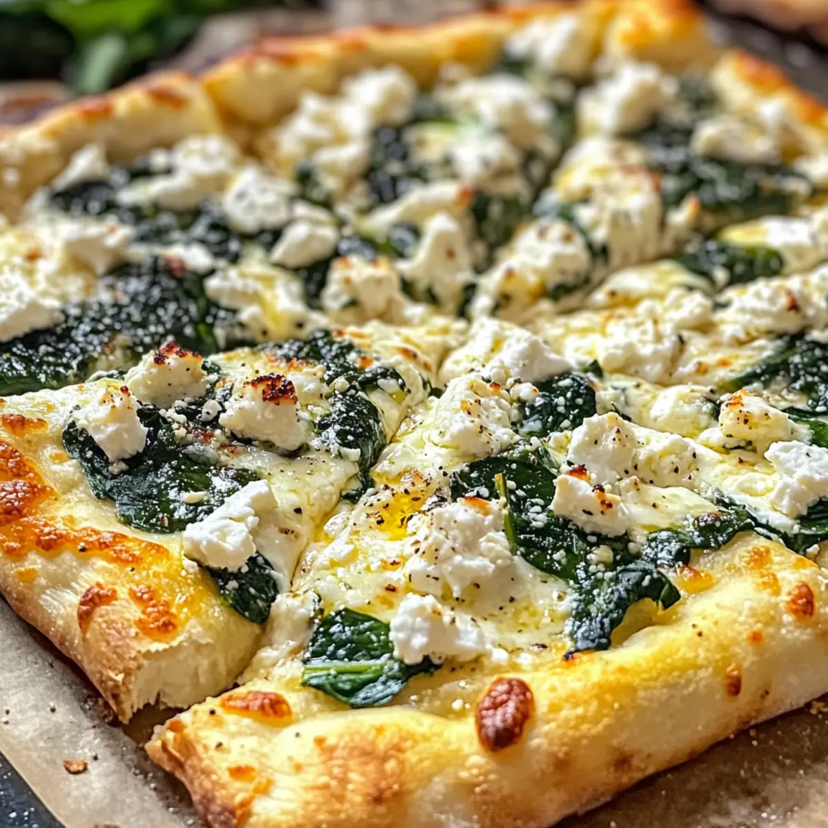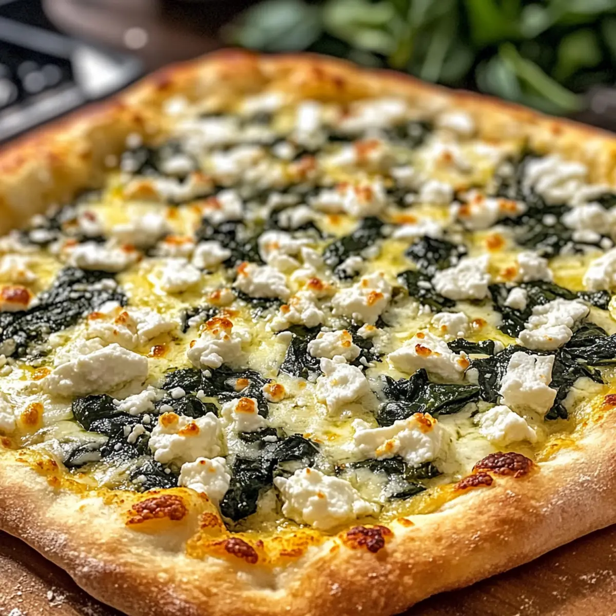 - Pizza belegen mit der Knoblauch-Ricotta-Mischung, sautiertem Spinat, Mozzarella und Feta.