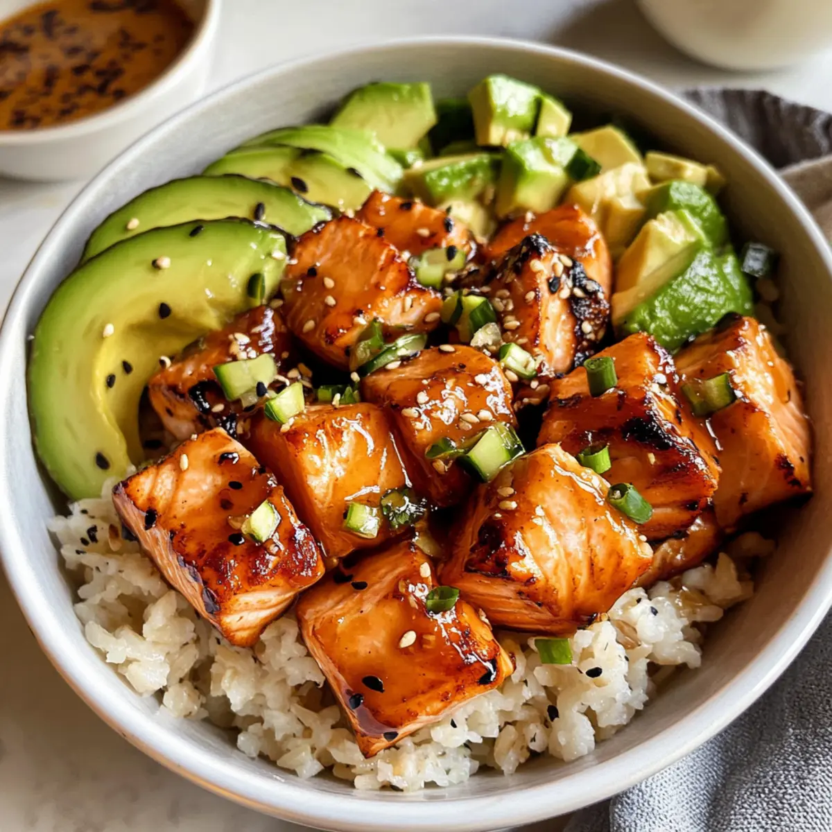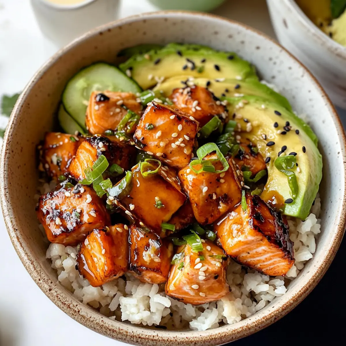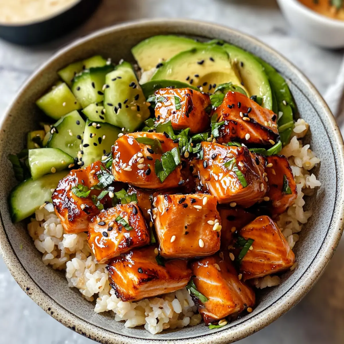 Vielseitig anpassbar: Du kannst die Basis von braunem Reis auf Quinoa oder Blumenkohlreis ändern und den Lachs durch Hühnchen ersetzen – die Möglichkeiten sind endlos!