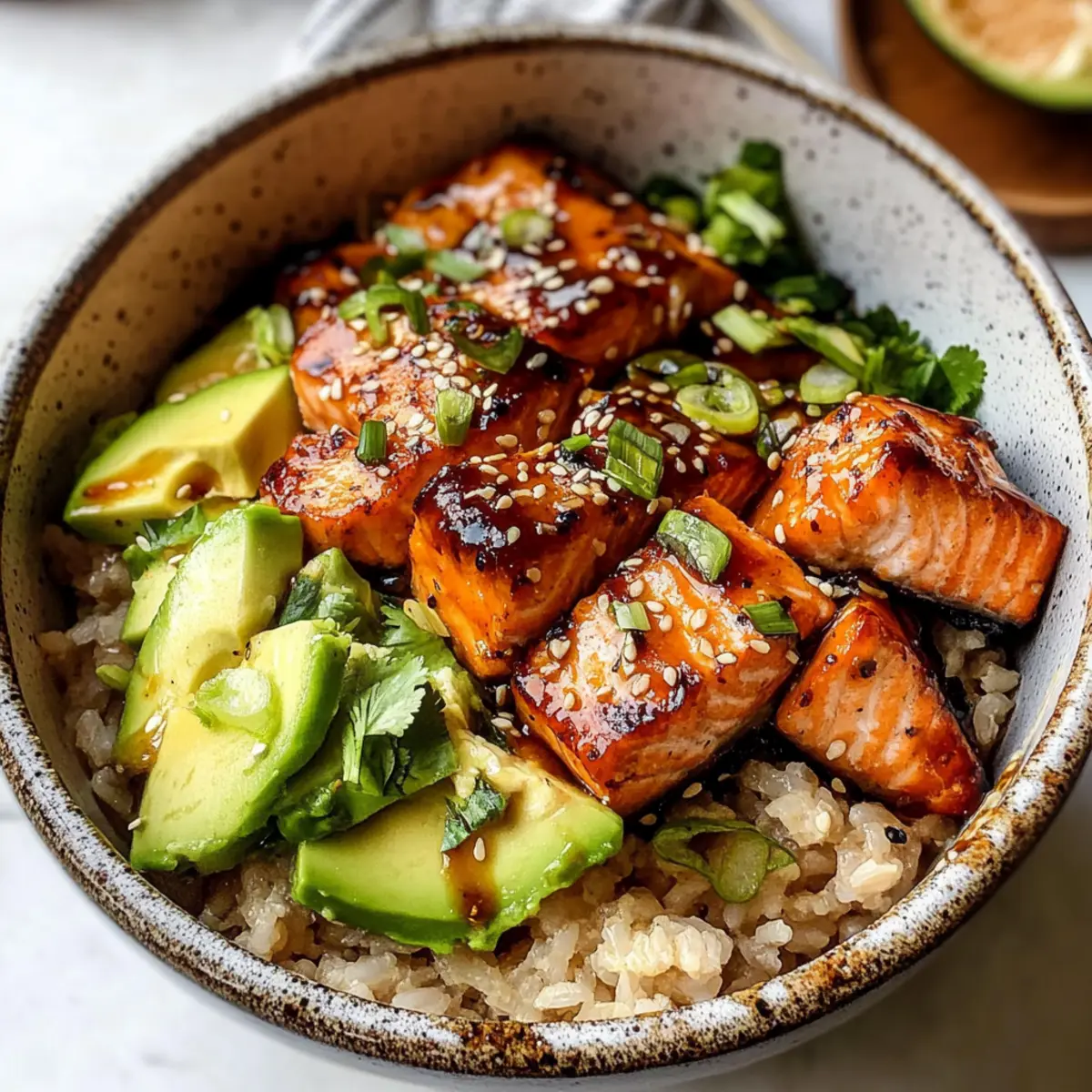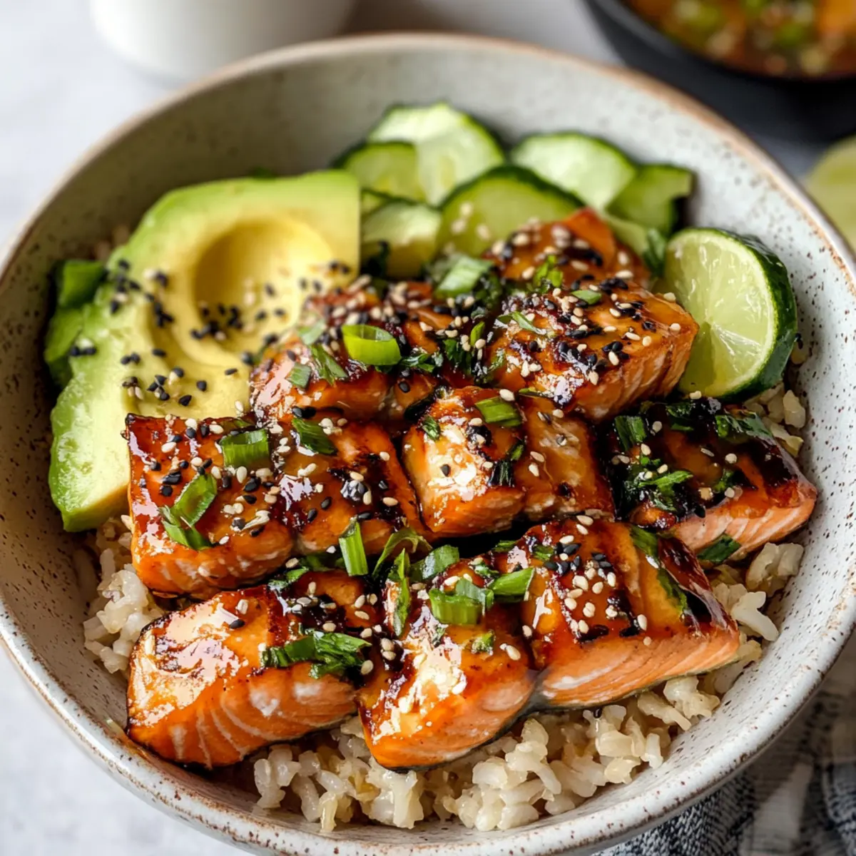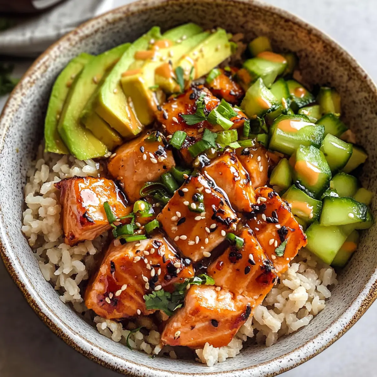 Beginne damit, eine Basis aus gekochtem braunem Reis in jeder Bowl zu platzieren. Füge dann den knusprig gebratenen Honigglasierten Lachs hinzu. Toppe die Bowls großzügig mit dem Gurkensalat und träufele das cremige Dressing darüber. Diese letzte Schicht sorgt für zusätzlichen Geschmack und eine ansprechende Optik.