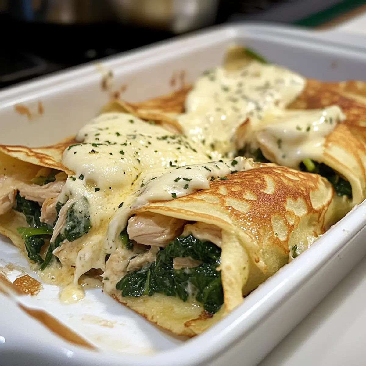 Die Hühnchen Florentiner Crepes sind perfekt für die Wochenvorbereitung! Sie können die Füllung (Hühnchen, Spinat und die cremigen Zutaten) bis zu 3 Tage im Voraus zubereiten und im Kühlschrank aufbewahren, um Aromen zu intensivieren. Einfach das Hühnchen anbraten, Spinat hinzufügen und die Sahne sowie den Käse unterrühren, dann in einem luftdichten Behälter im Kühlschrank lagern. Achten Sie darauf, die Crepes erst kurz vor dem Servieren zu füllen und zu backen, um ihre zarte Textur zu bewahren. Wenn Sie bereit sind, die Crepes zuzubereiten, füllen Sie sie mit der vorbereiteten Mischung, legen Sie sie in die Auflaufform und backen Sie sie für etwa 15 Minuten, bis der Käse goldbraun und sprudelnd ist. So genießen Sie eine köstliche Mahlzeit mit minimalem Aufwand während der Woche!