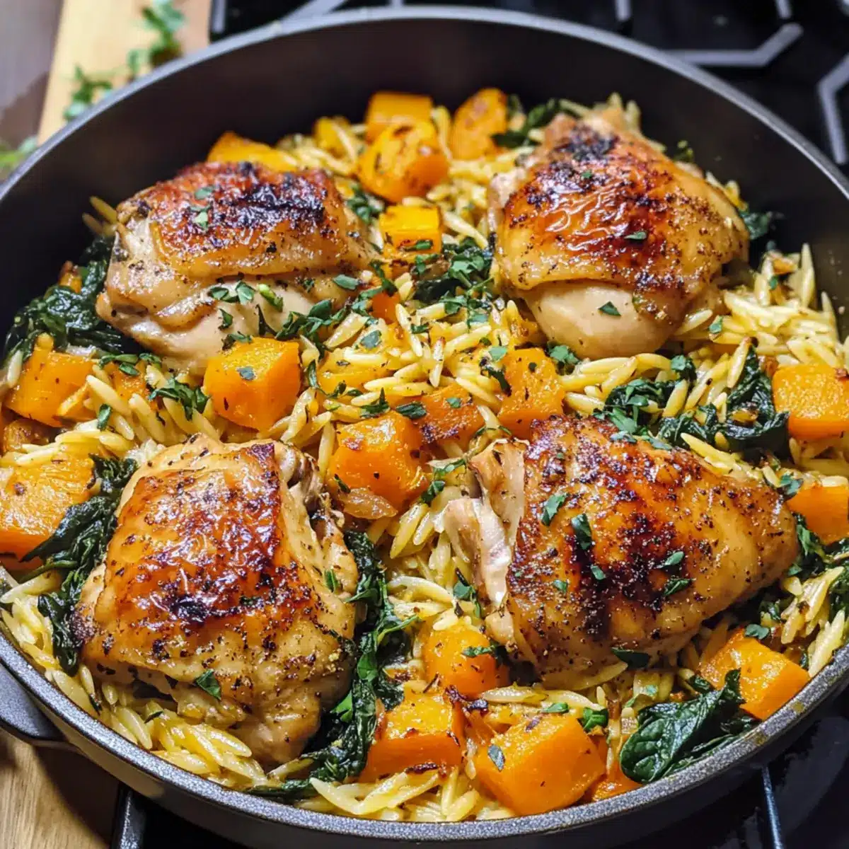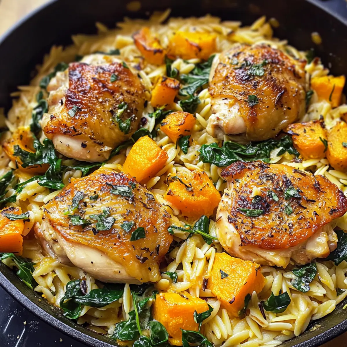 Hühnchen Orzo mit Butternut und Spinat genießen