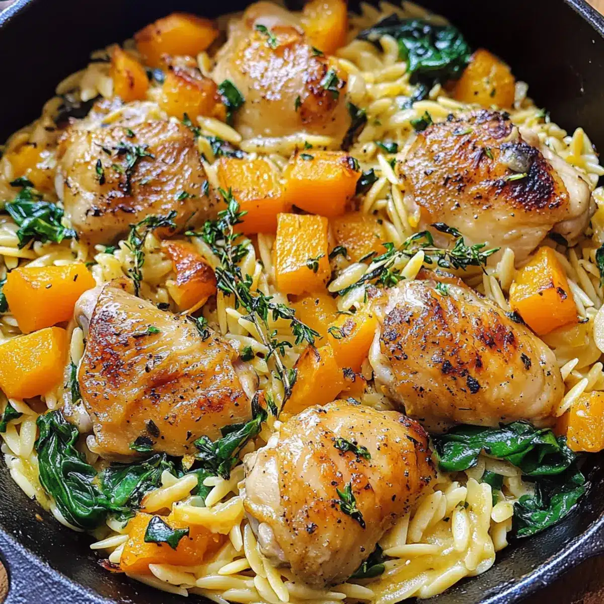 Intensiver Geschmack: Die Kombination aus geröstetem Butternut-Kürbis, herzhaftem Hühnchen und cremigem Orzo sorgt für ein geschmackliches Erlebnis, das dich begeistern wird.