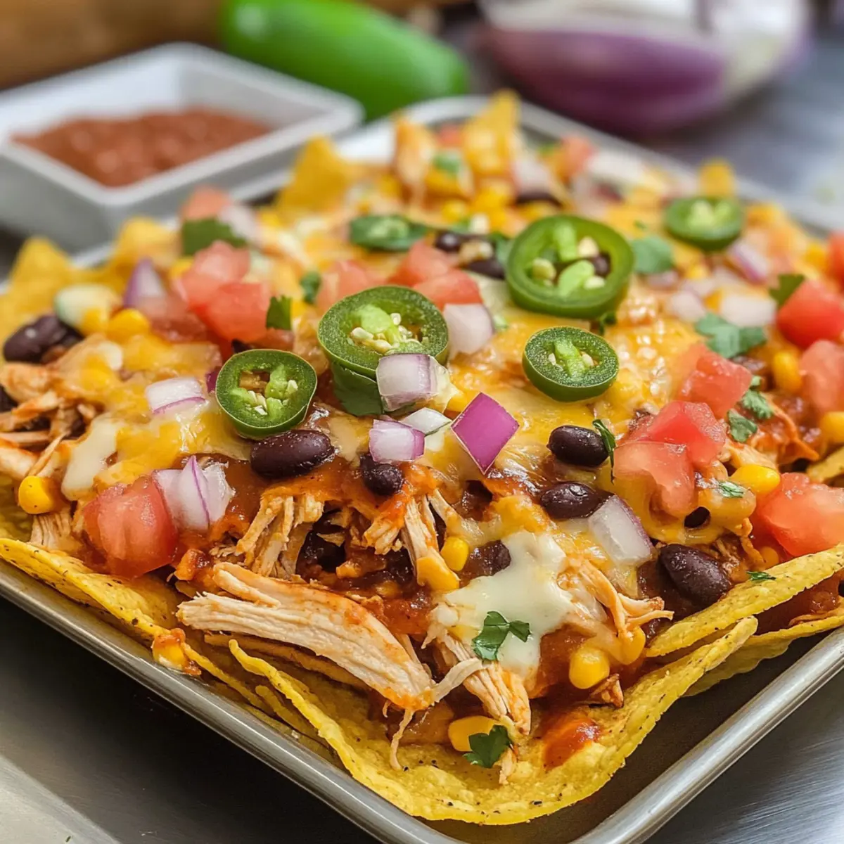 Die Kombination aus knusprigen Tortilla-Chips und zartem BBQ-Hühnchen ist einfach unschlagbar! Als ich das erste Mal diese Hühnchen Nachos zubereitet habe, konnte ich kaum glauben, wie schnell sie zubereitet waren und wie perfekt sie für einen gemütlichen Abend oder ein aufregendes Spiel-Wochenende sind. Diese Loaded BBQ Chicken Nachos sind nicht nur ein schnelles Abendessen, sondern auch eine wahre Freude für die ganze Familie. Genießen Sie die köstliche Verschmelzung von Aromen und Texturen, während Sie Ihre Nachos mit frischen Zutaten individuell gestalten. Wer kann bei solch einem verlockenden Snack schon widerstehen? Bereiten Sie sich auf ein Geschmackserlebnis vor, das bestimmt nach mehr verlangt!