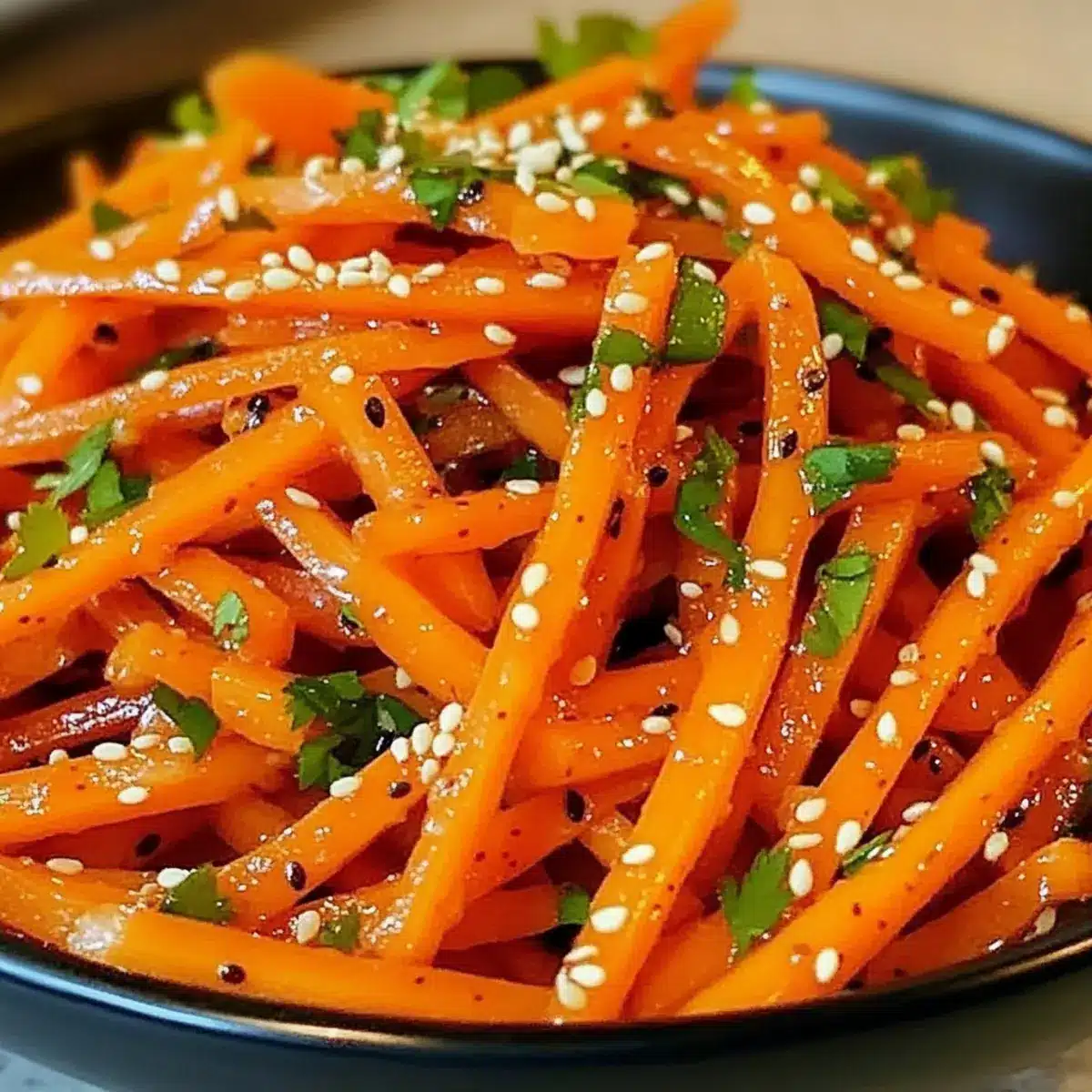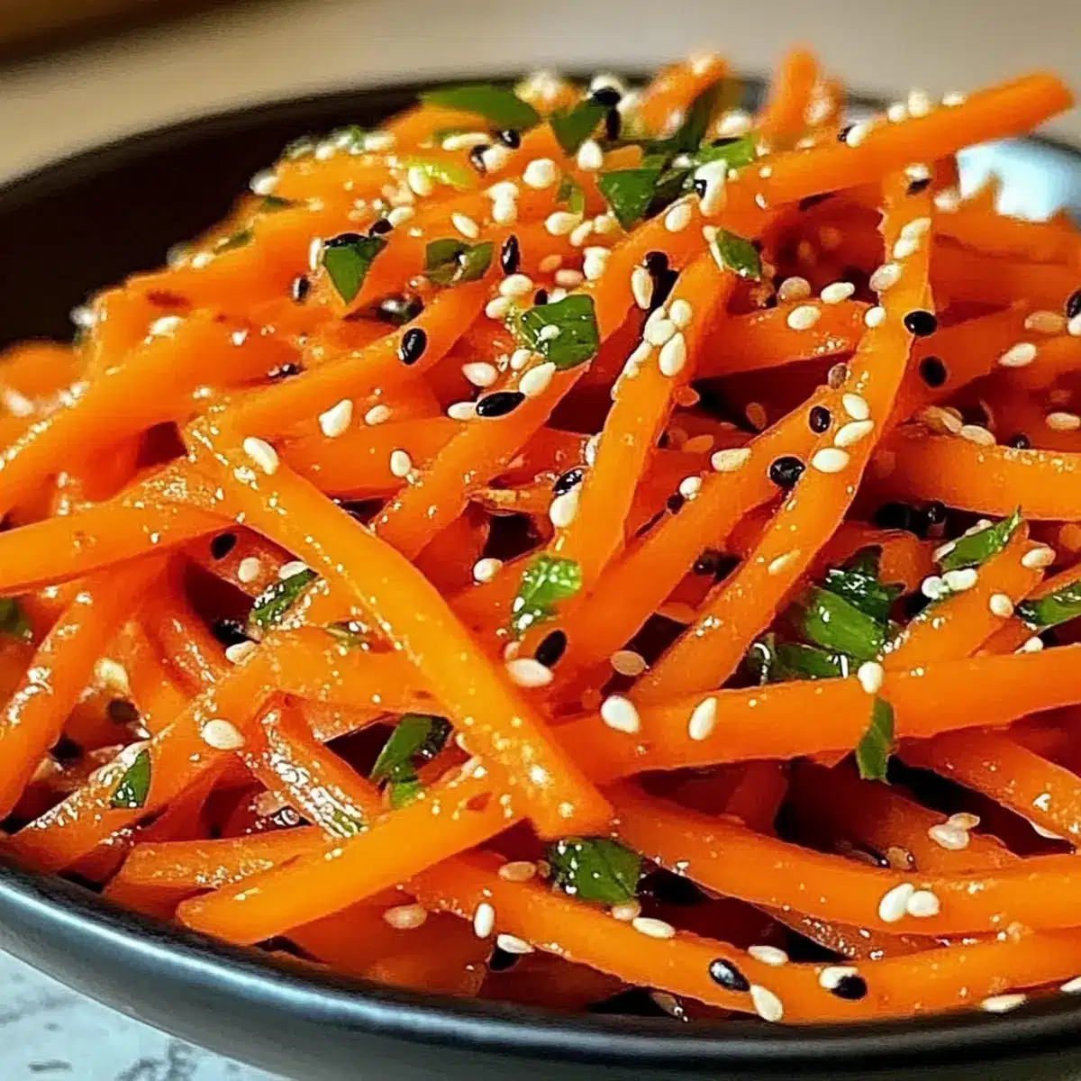 Vor dem Servieren den Karotten-Salat garnieren. Streuen Sie geröstete Sesamkerne darüber, um eine angenehme Crunch-Textur zu erzielen. Servieren Sie den Salat kalt oder bei Zimmertemperatur als erfrischende Beilage oder als eigenständigen Snack. Der leuchtende Karotten-Salat ist jetzt bereit, genossen zu werden!
