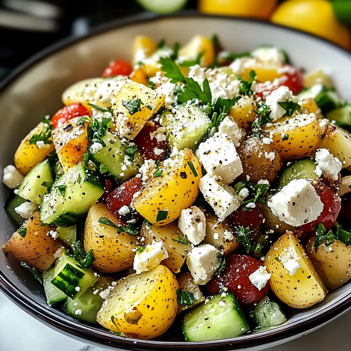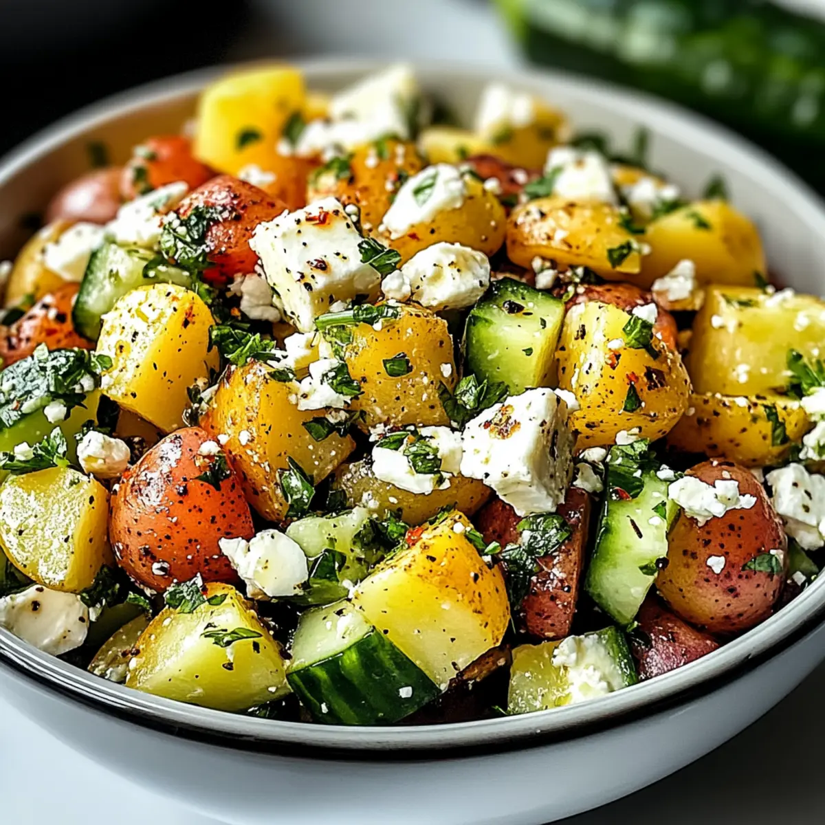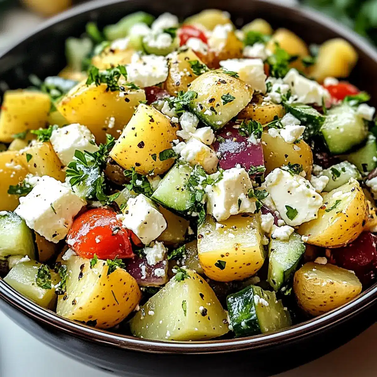 - Optionale Variationen: Füge Kichererbsen für mehr Protein hinzu oder ersetze Feta durch eine milchfreie Option, um den Kartoffelsalat vielseitig zu gestalten.