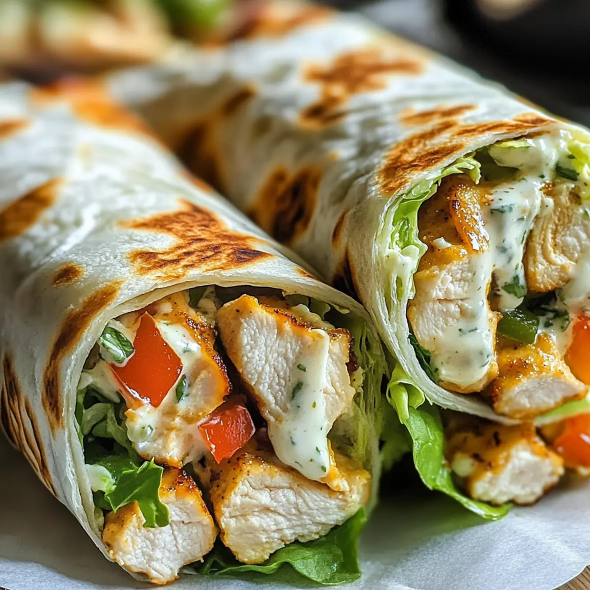 - Step 5: Wraps füllen: Lege eine Portion gebratenes Hähnchen und frisches Gemüse auf einen Wrap und füge Knoblauch-Dip hinzu.