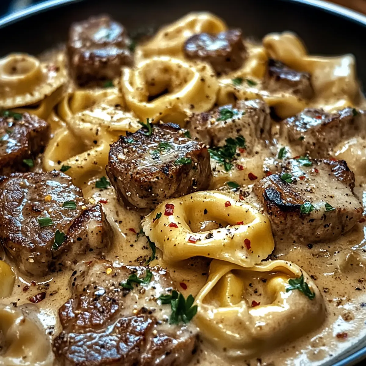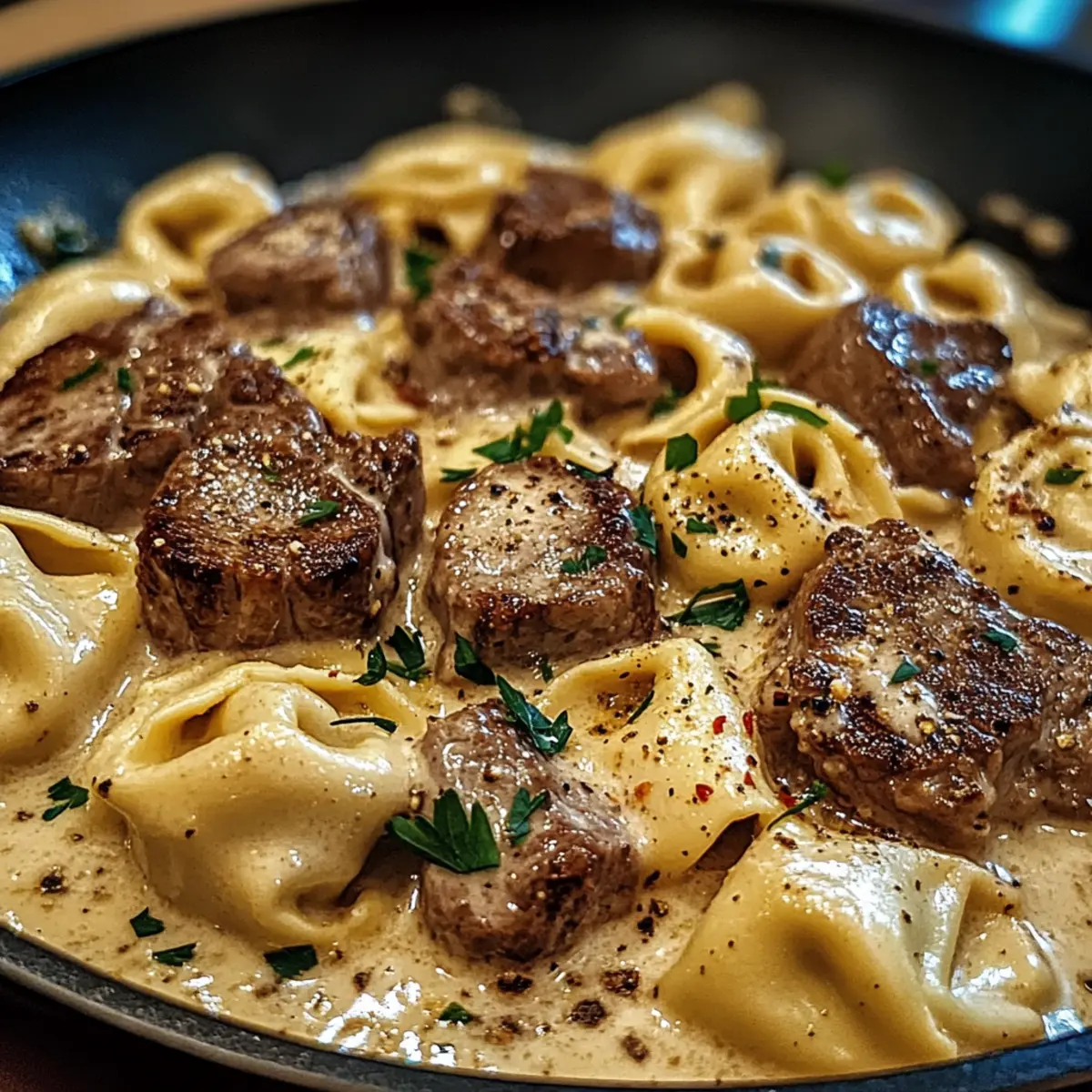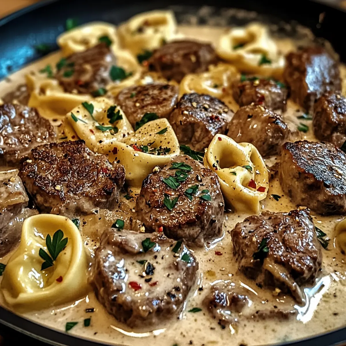 Füge die gekochten Tortellini und das geschnittene Steak in die Pfanne mit der Sauce hinzu. Vermische alles vorsichtig für etwa 2 Minuten, bis die Tortellini und das Steak gleichmäßig mit der cremigen Sauce umhüllt sind.