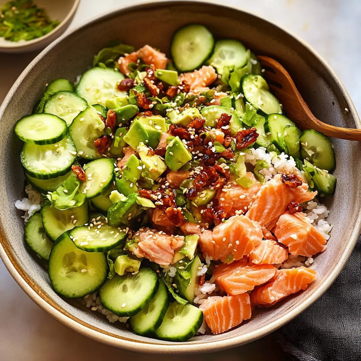 Vegan: Verwende Tofu anstelle von Lachs, um eine pflanzliche Proteinquelle zu schaffen. Der Tofu kann gut mariniert und gebraten werden, um jedem Bissen mehr Geschmack zu verleihen. So bleibt dein Salat nahrhaft und lecker!
