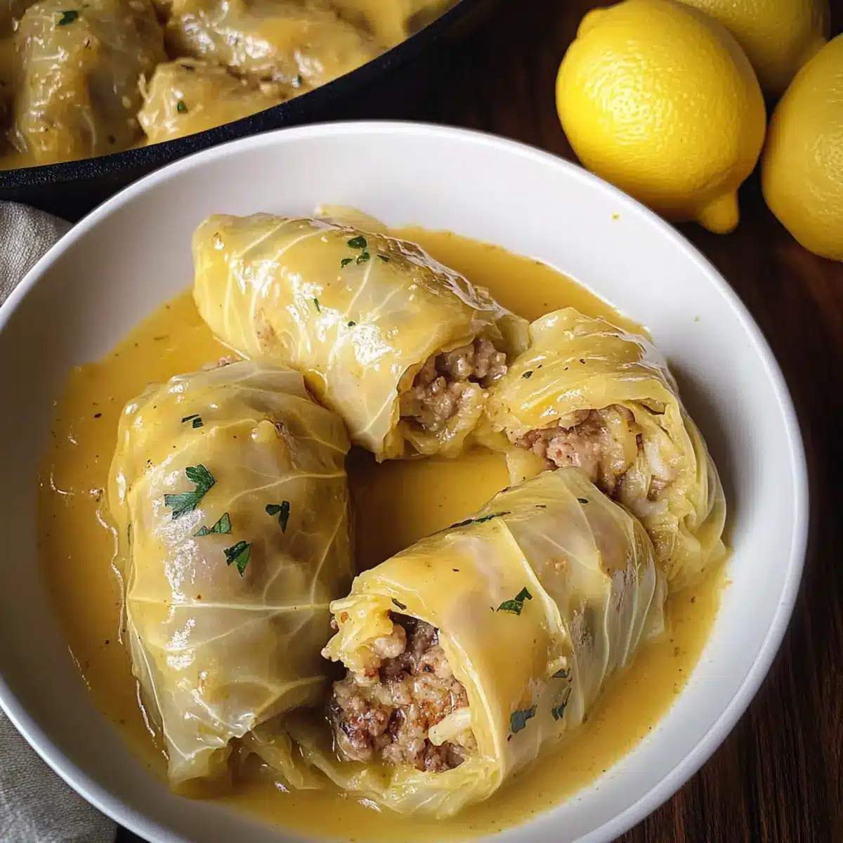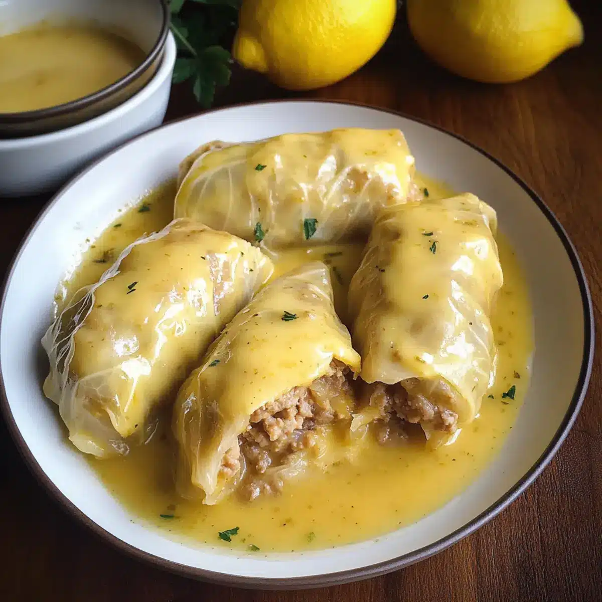 Gieße die Ei-Zitronen-Sauce über die heißen Kohlwickel im Topf und lasse sie bei niedriger Hitze für weitere 10 Minuten ziehen, damit sich die Aromen verbinden. Serviere die saftigen Kohlwickel heiß, garniert mit zusätzlichem Zitronensaft und frisch gemahlenem Pfeffer für einen erfrischenden Geschmack.