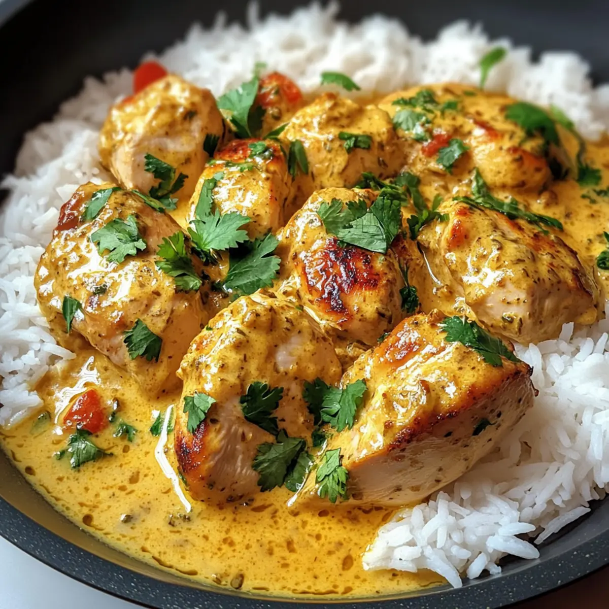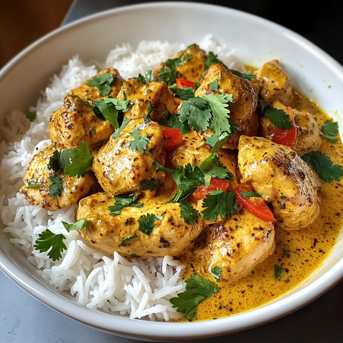 Servieren Sie das Kokosnuss-Hühnchen heiß über gedämpften Reis und garnieren Sie es nach Belieben mit zusätzlichem Koriander. Diese Kombination sorgt dafür, dass jeder Biss cremig und geschmackvoll ist, perfekt als herzhaftes Wohlfühlessen!