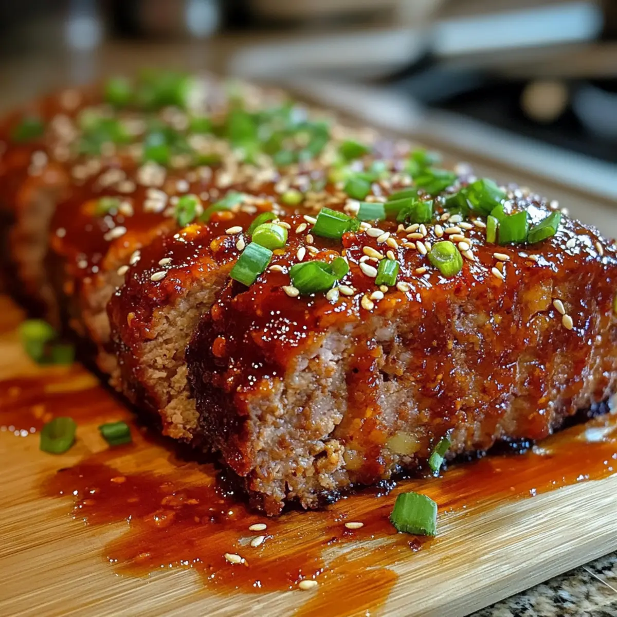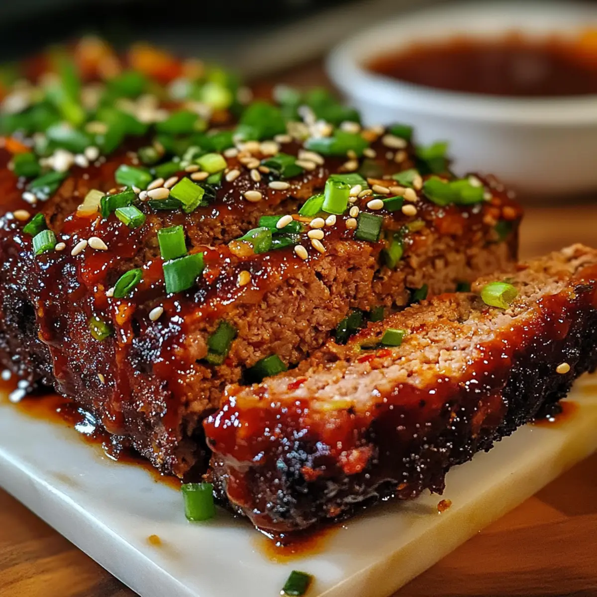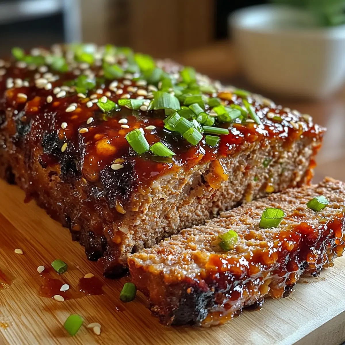 Schneide den koreanischen BBQ-Fleischlaib in gleichmäßige Stücke und garniere ihn mit den frisch gehackten Frühlingszwiebeln und optionalen Sesamsamen. Diese sorgen nicht nur für eine ansprechende Optik, sondern verstärken auch die Frische und den Geschmack des Gerichts. Serviere ihn warm mit einem Beilagenangebot deiner Wahl.