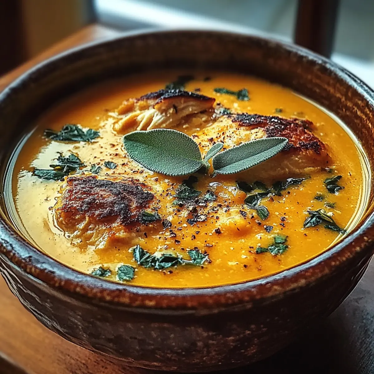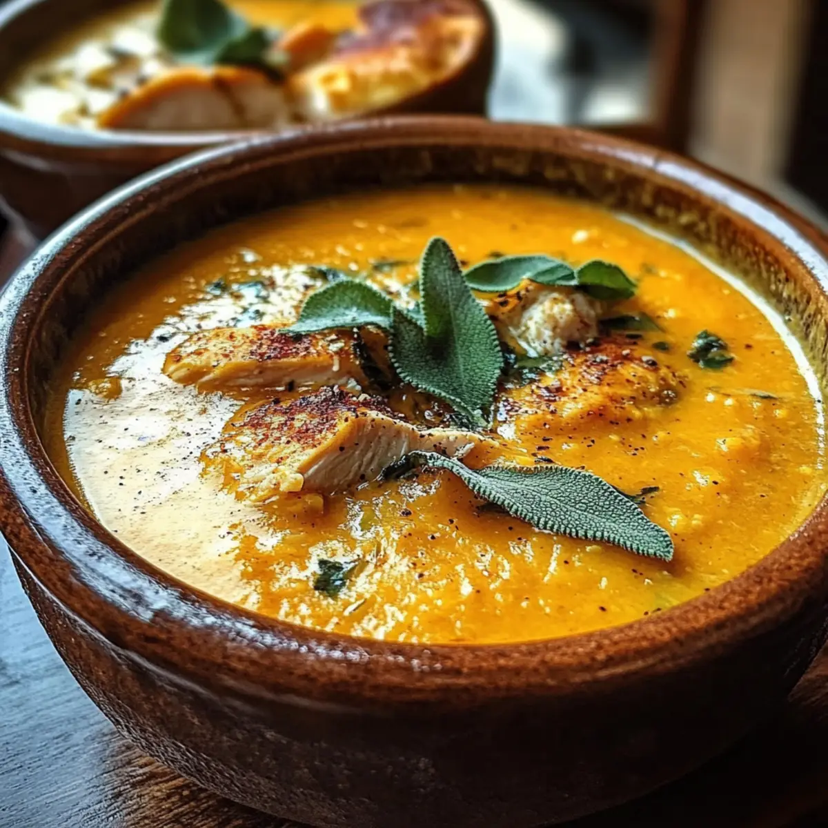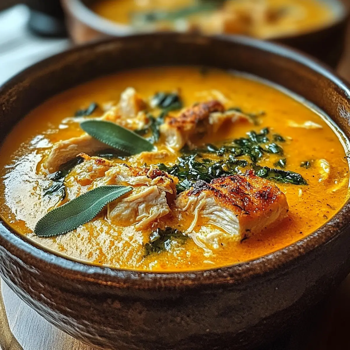 Auffrischen: Um den frischen Geschmack zu intensivieren, kannst du beim Aufwärmen frischen Salbei hinzufügen, bevor du die Kürbis Hühnchen Suppe servierst.