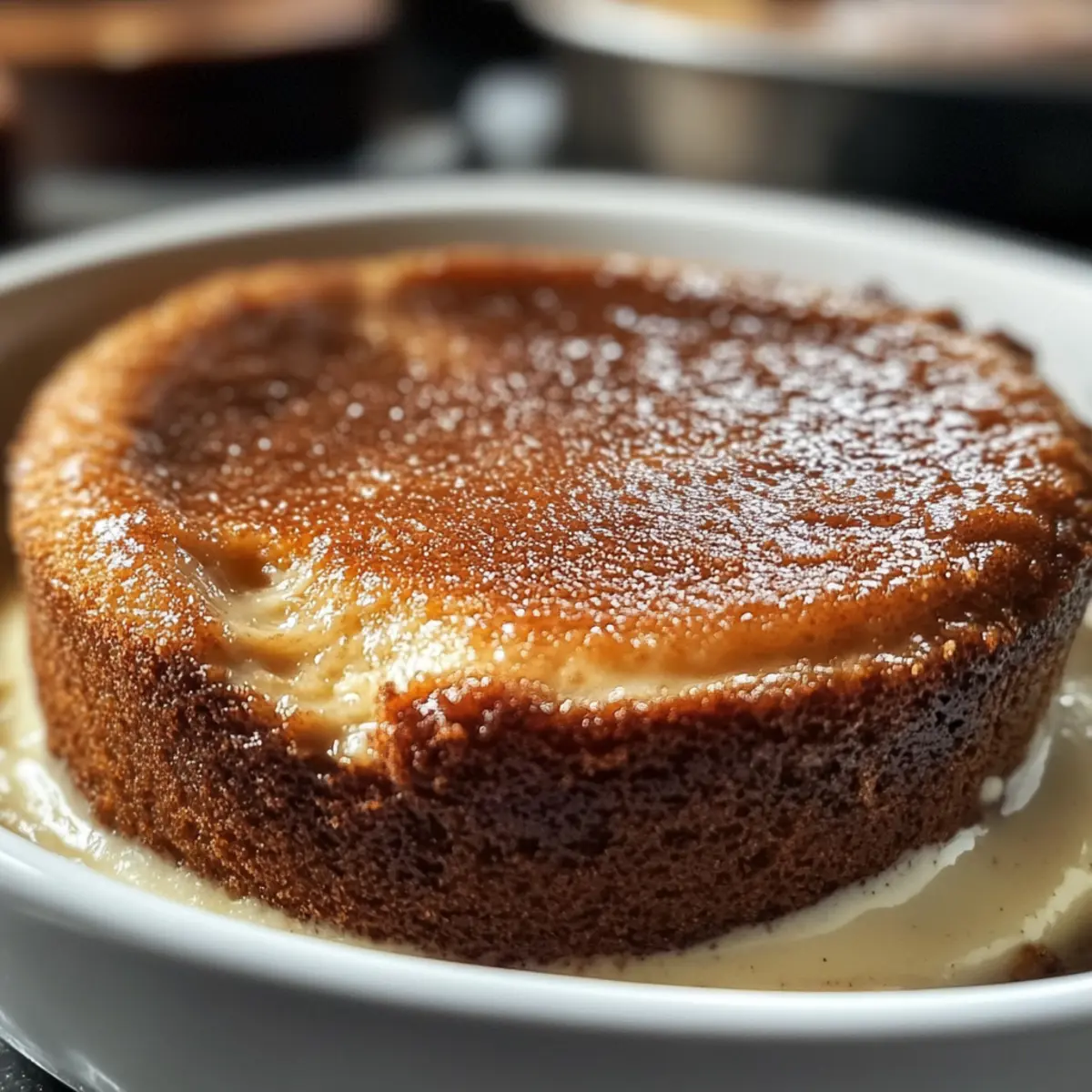 Backe den Lebkuchenpudding im vorgeheizten Ofen für 45-50 Minuten. Der Pudding ist fertig, wenn er fest geworden ist und die Oberseite eine appetitliche goldene Farbe angenommen hat. Teste mit einem Messer in der Mitte; sollte es sauber herauskommen, ist er perfekt!
