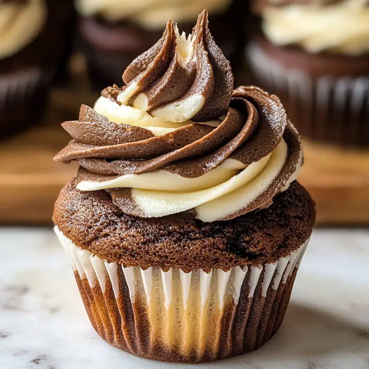 Füllen Sie einen Spritzbeutel mit beiden Frostings, sodass sie nebeneinander liegen. Spritzen Sie elegante Wirbel auf die abgekühlten Marmorküchlein, um eine wunderschöne Präsentation zu erzielen, die jeden beeindruckt.