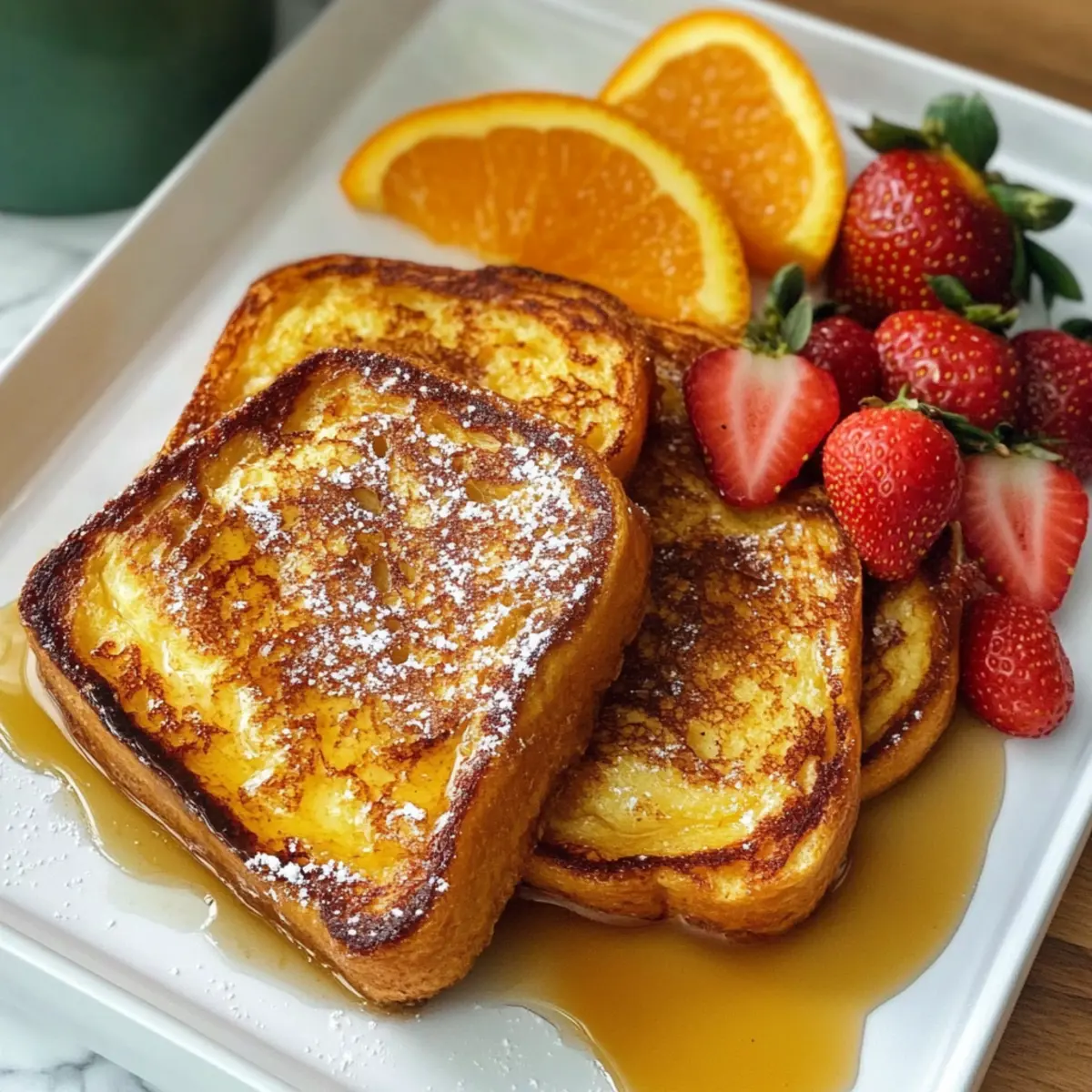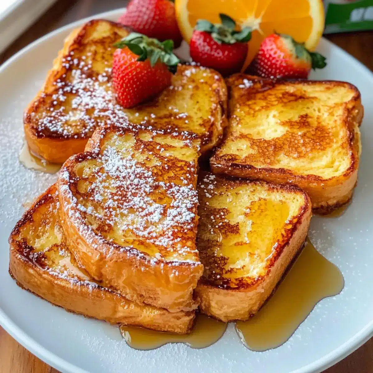 - Die fertig gebratenen Scheiben auf einen Teller legen und nach Belieben mit Ahornsirup, frischen Früchten oder Zimtzucker garnieren.