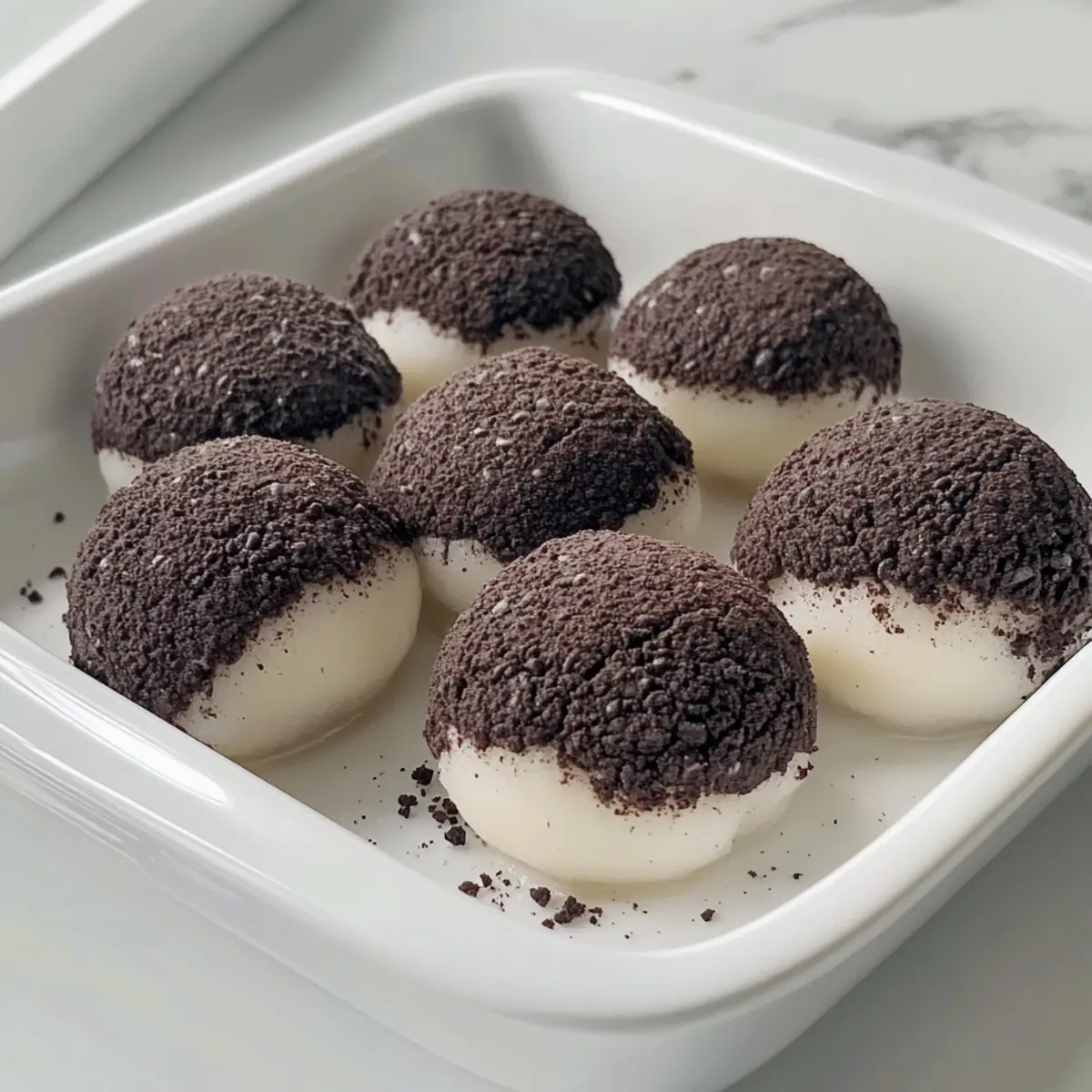 - Rolle jedes Mochi-Bällchen gründlich in den zerkrümelten Oreo-Keksen.