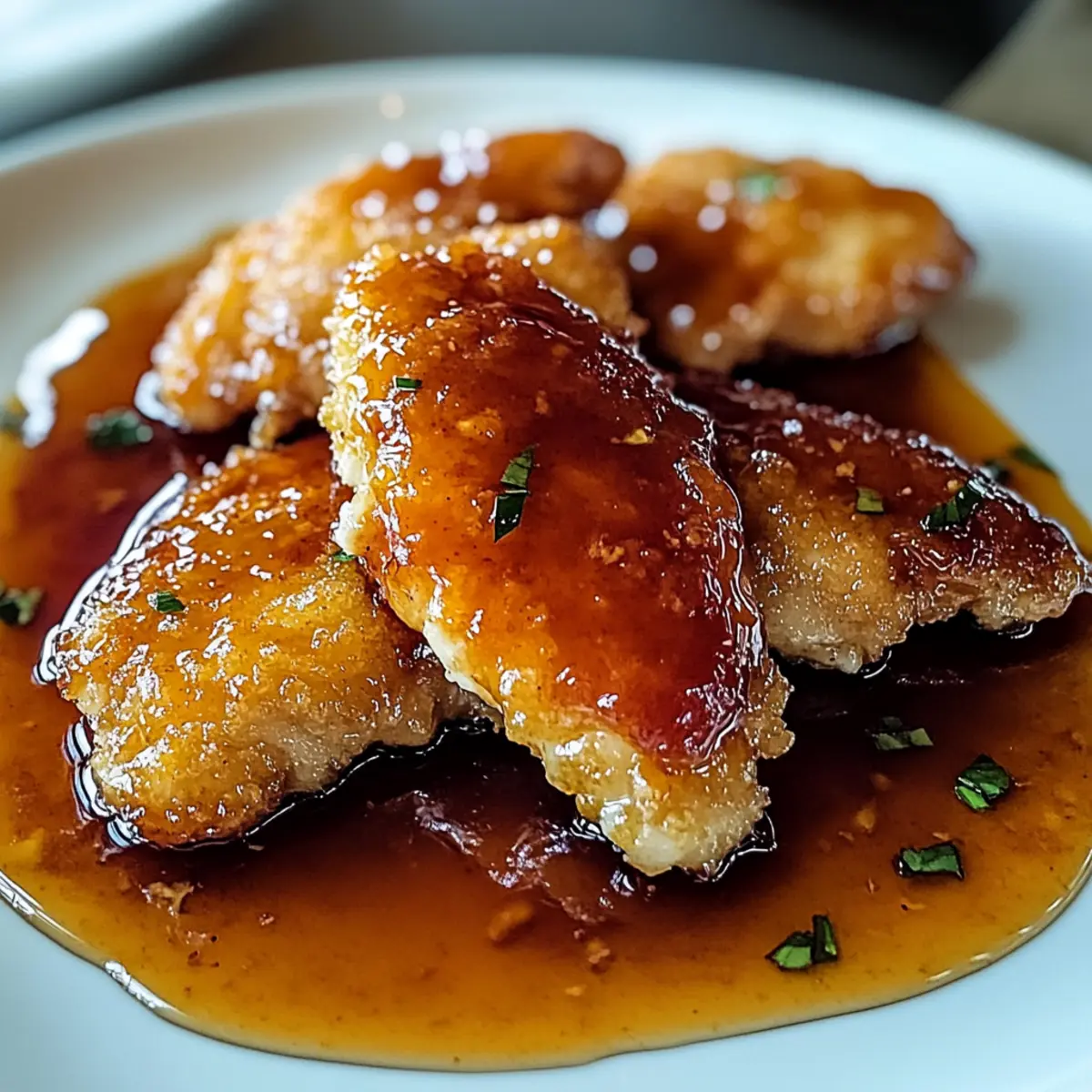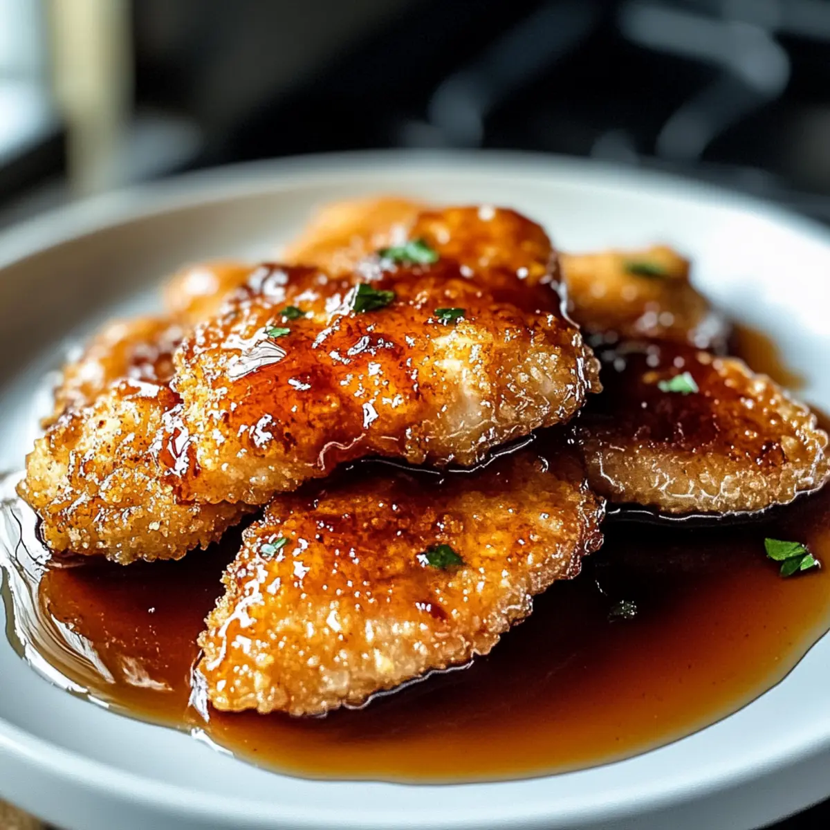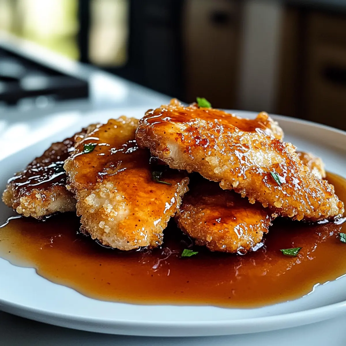 - Drizzle die warme Hot Honey-Sauce über die Schnitzel und garniere sie nach Belieben mit frisch gehackter Petersilie.