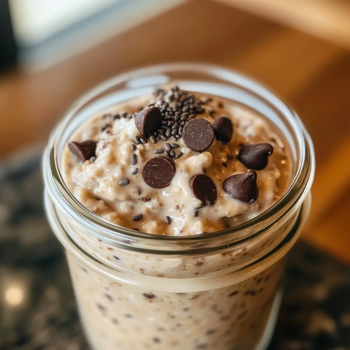 - Am nächsten Morgen, rühre die Schokoladenkeks Overnight Oats vor dem Servieren gut um und füge Toppings hinzu.