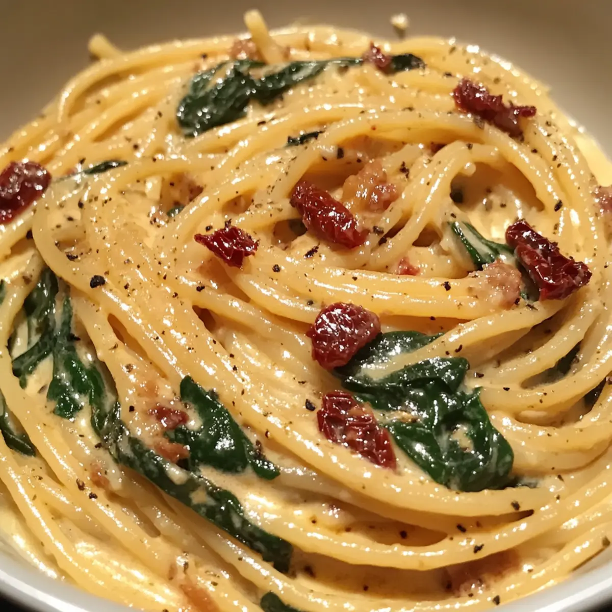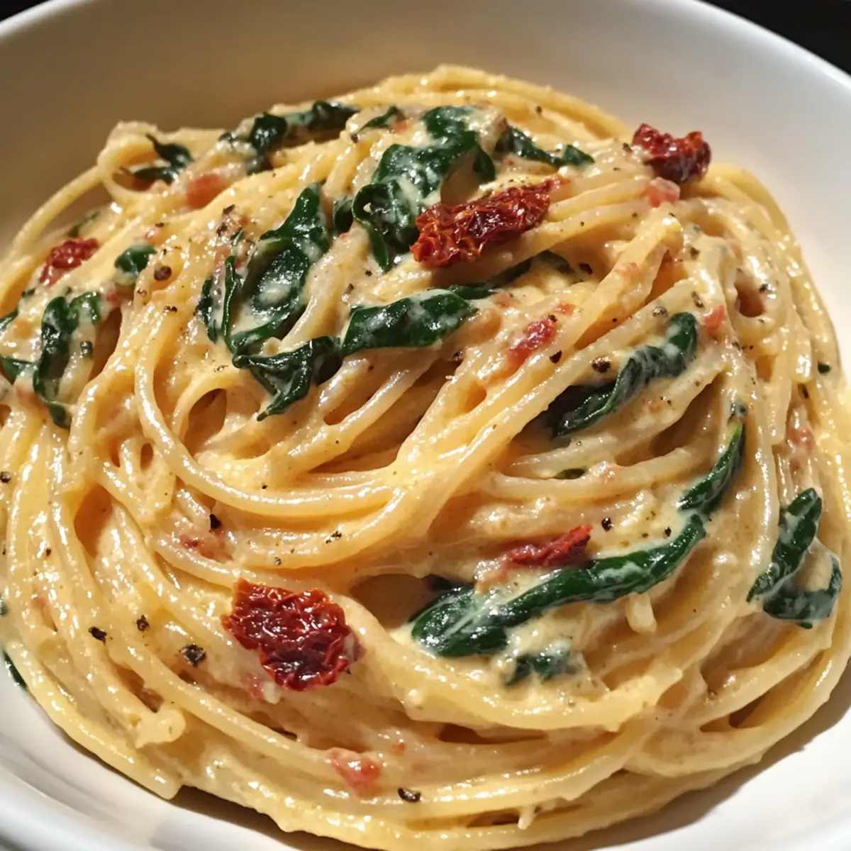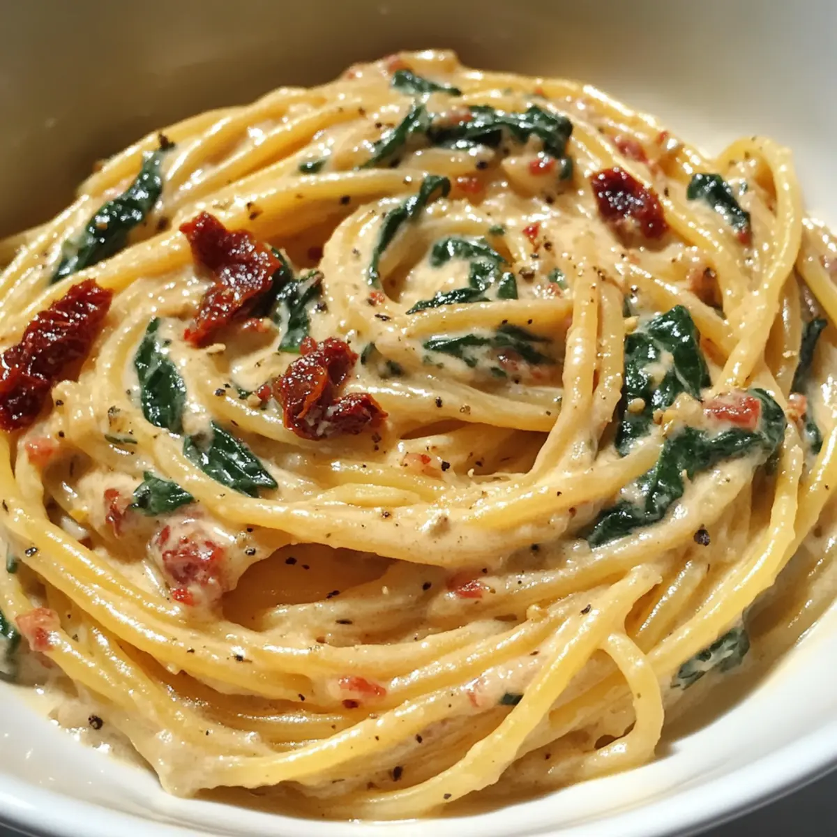 Schritt-für-Schritt-Anleitung für cremige Spaghetti und Spinat mit getrockneter Tomatensauce