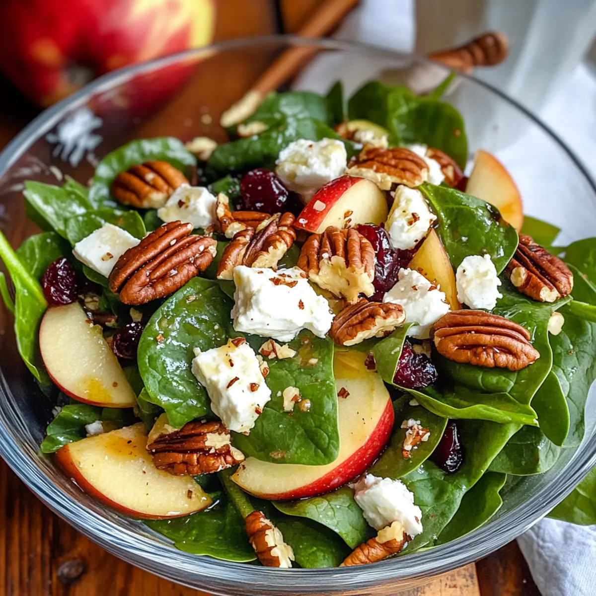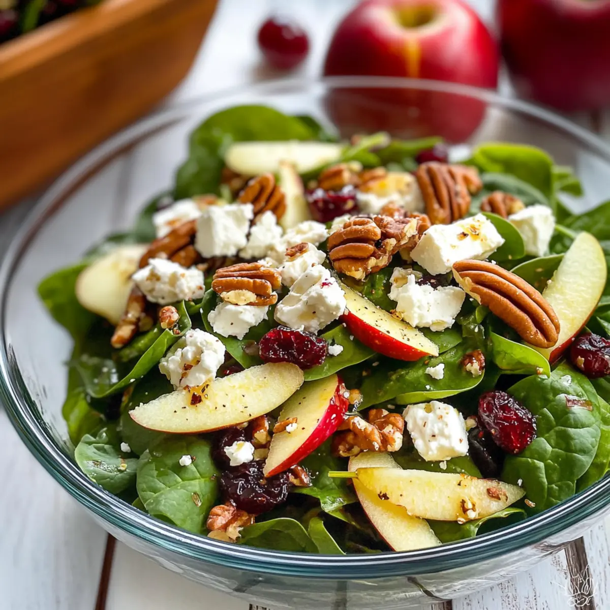 - Nehme eine große Servierschüssel und füge frischen Spinat als Basis hinzu. Ergänze dies mit den Äpfeln, Zwiebeln, Pekannüssen, Feta und Cranberries.