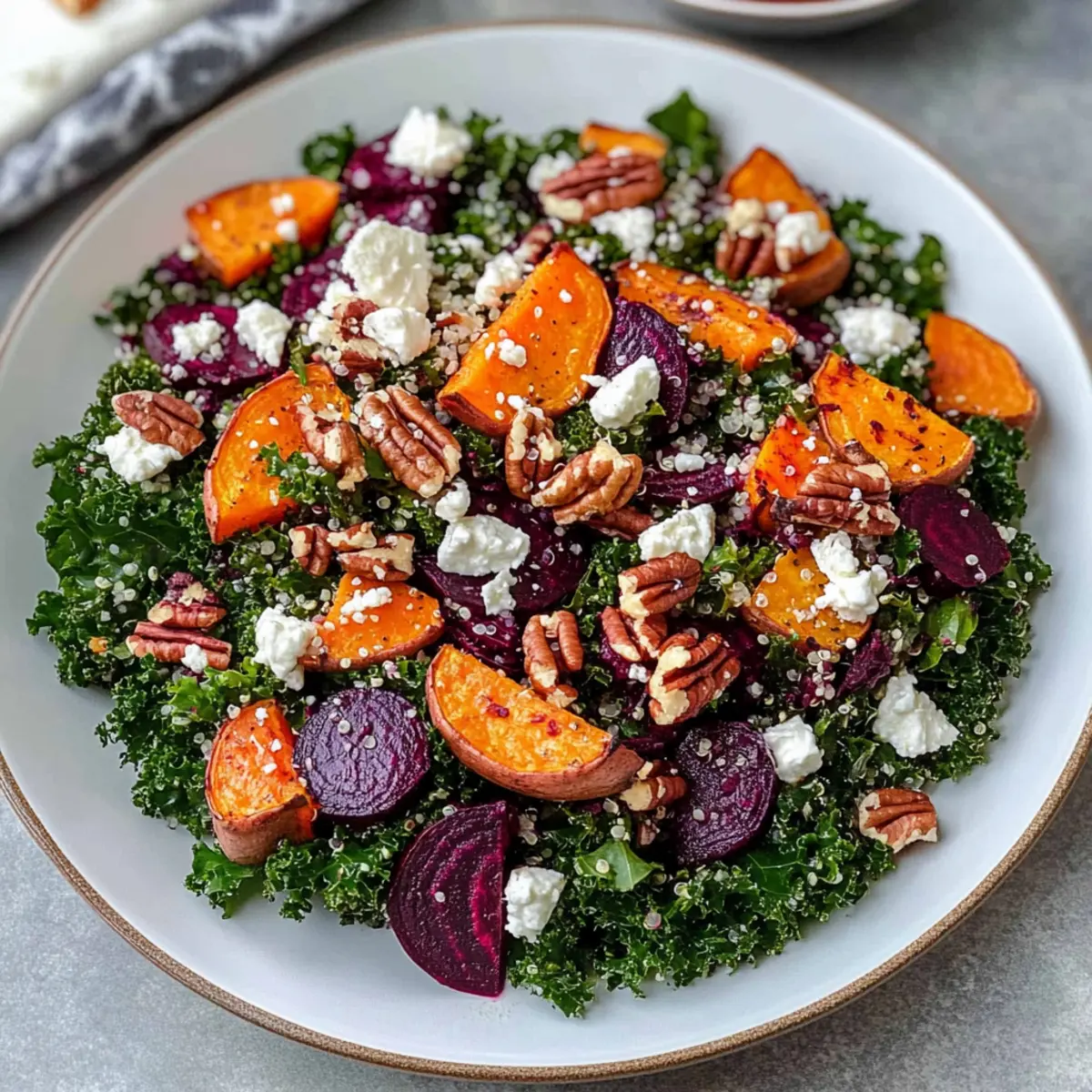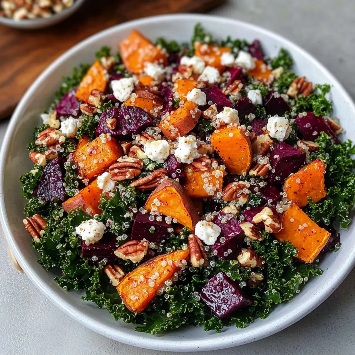 - Kombiniere die gerösteten Süßkartoffeln, Rote Bete, gekochte Quinoa, massierten Grünkohl, Rosinen und Pekannüsse in einer großen Schüssel.